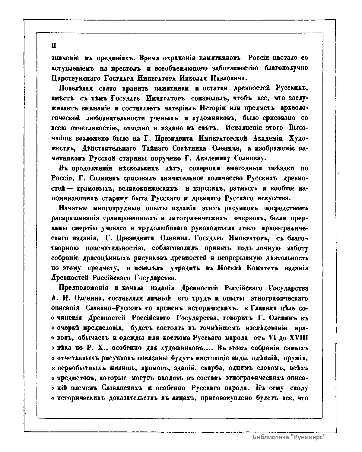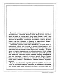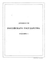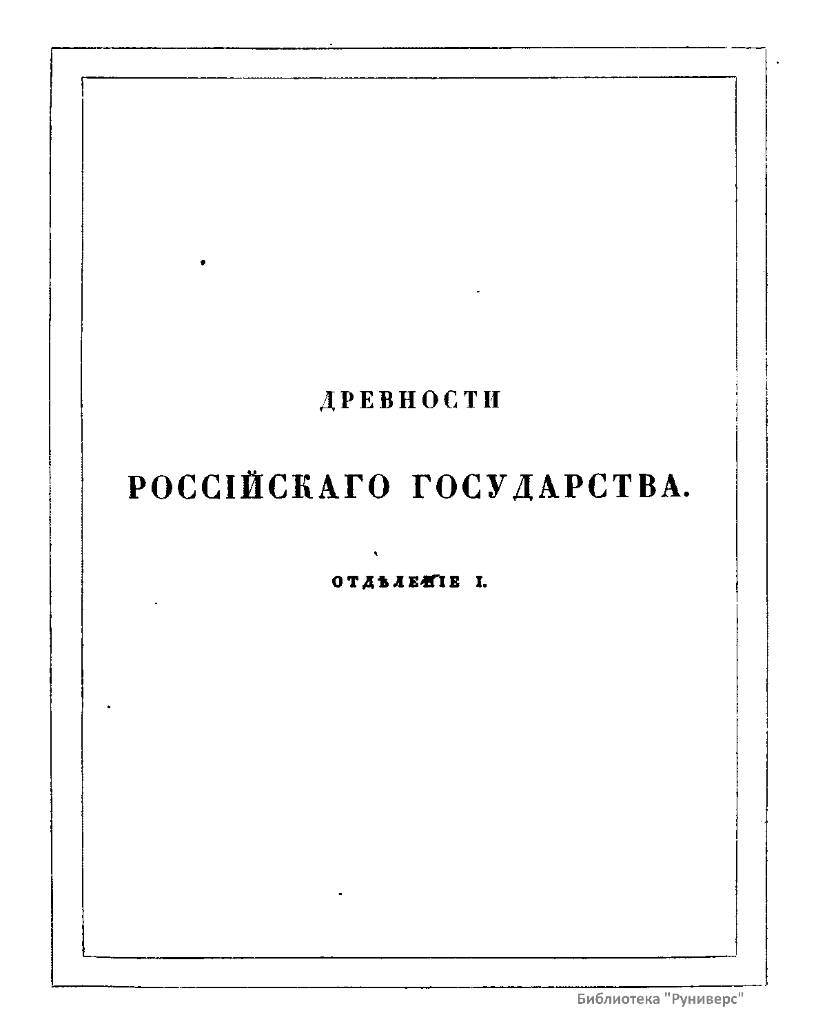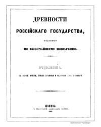 Авторы настоящего издания считают, что время охранения памятников России настало со вступления на престол Императора Николая I. Повелевая хранить памятники и остатки русских древностей, он приказал все, что заслуживает внимание и составляет материал истории, отчетливо срисовать, описать и издать. Император повелел учредить в Москве Комитет издания древностей Российского государства. Первый отдел огромного и великолепного издания «Древности Российского государства» состоит из 500 большого формата рисунков, распределенных по своему содержанию на шесть частей с соответствующим описанием. Первая часть «Древностей» заключает в себе священные памятники: а) образа и кресты, замечательные в историческом и художественном отношении, б) храмовую утварь разных времен, в) облачения духовного сана. Вторая часть содержит древний царский чин, или священное облачение русских великих князей и царей при поставлении на царство. В третьей части представлена древняя броня и оружие. Четвертую часть составляют древние великокняжеские, царские, боярские и местные народные одежды в изображениях и портретах. В пятой части можно увидеть древнюю царскую столовую утварь. Шестая часть состоит из памятников древнего русского зодчества.