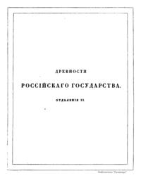 Авторы настоящего издания считают, что время охранения памятников России настало со вступления на престол Императора Николая I. Повелевая хранить памятники и остатки русских древностей, он приказал все, что заслуживает внимание и составляет материал истории, отчетливо срисовать, описать и издать. Император повелел учредить в Москве Комитет издания древностей Российского государства. Первый отдел огромного и великолепного издания «Древности Российского государства» состоит из 500 большого формата рисунков, распределенных по своему содержанию на шесть частей с соответствующим описанием. Первая часть «Древностей» заключает в себе священные памятники: а) образа и кресты, замечательные в историческом и художественном отношении, б) храмовую утварь разных времен, в) облачения духовного сана. Вторая часть содержит древний царский чин, или священное облачение русских великих князей и царей при поставлении на царство. В третьей части представлена древняя броня и оружие. Четвертую часть составляют древние великокняжеские, царские, боярские и местные народные одежды в изображениях и портретах. В пятой части можно увидеть древнюю царскую столовую утварь. Шестая часть состоит из памятников древнего русского зодчества.