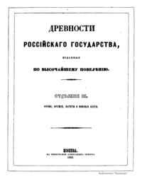 Авторы настоящего издания считают, что время охранения памятников России настало со вступления на престол Императора Николая I. Повелевая хранить памятники и остатки русских древностей, он приказал все, что заслуживает внимание и составляет материал истории, отчетливо срисовать, описать и издать. Император повелел учредить в Москве Комитет издания древностей Российского государства. Первый отдел огромного и великолепного издания «Древности Российского государства» состоит из 500 большого формата рисунков, распределенных по своему содержанию на шесть частей с соответствующим описанием. Первая часть «Древностей» заключает в себе священные памятники: а) образа и кресты, замечательные в историческом и художественном отношении, б) храмовую утварь разных времен, в) облачения духовного сана. Вторая часть содержит древний царский чин, или священное облачение русских великих князей и царей при поставлении на царство. В третьей части представлена древняя броня и оружие. Четвертую часть составляют древние великокняжеские, царские, боярские и местные народные одежды в изображениях и портретах. В пятой части можно увидеть древнюю царскую столовую утварь. Шестая часть состоит из памятников древнего русского зодчества.
