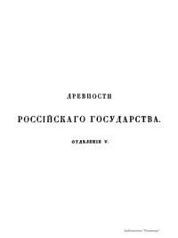 Авторы настоящего издания считают, что время охранения памятников России настало со вступления на престол Императора Николая I. Повелевая хранить памятники и остатки русских древностей, он приказал все, что заслуживает внимание и составляет материал истории, отчетливо срисовать, описать и издать. Император повелел учредить в Москве Комитет издания древностей Российского государства. Первый отдел огромного и великолепного издания «Древности Российского государства» состоит из 500 большого формата рисунков, распределенных по своему содержанию на шесть частей с соответствующим описанием. Первая часть «Древностей» заключает в себе священные памятники: а) образа и кресты, замечательные в историческом и художественном отношении, б) храмовую утварь разных времен, в) облачения духовного сана. Вторая часть содержит древний царский чин, или священное облачение русских великих князей и царей при поставлении на царство. В третьей части представлена древняя броня и оружие. Четвертую часть составляют древние великокняжеские, царские, боярские и местные народные одежды в изображениях и портретах. В пятой части можно увидеть древнюю царскую столовую утварь. Шестая часть состоит из памятников древнего русского зодчества.