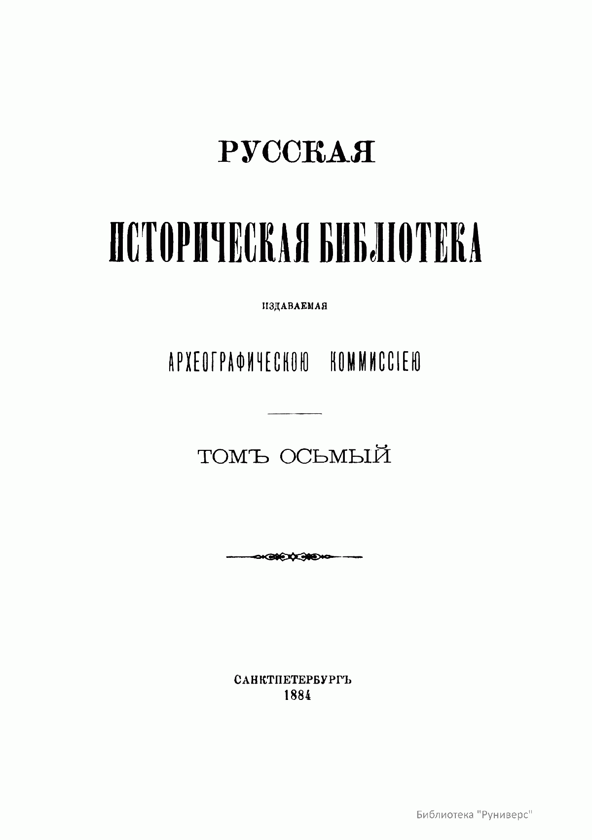 Русская историческая библiотека, издаваемая Археографическою комиссiею. Томъ осьмый