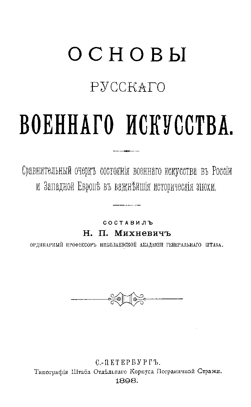 Авторский курс развития сравнительного военного искусства, подготовленный выдающимся военным историком России генералом Н.П. Михневичем (в 1904-1907 гг. – начальник Николаевской Академии Генштаба) для высших военных учебных заведений, представляет собой один из лучших образцов эволюции отечественной военной истории конца XIX века.