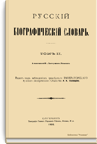 Русский биографический словарь (25 томов), в состав которого вошли имена и биографии виднейших деятелей государства, науки, просвещения и церковных деятелей, издавался Русским историческим обществом с 1896 по 1918 год. Русское историческое общество было основано в Санкт-Петербурге в 1866 году по инициативе известных отечественных историков, военных и государственных деятелей и ставило своей целью всесторонне содействовать развитию русского национального исторического просвещения. Общество пользовалось покровительством и финансовой поддержкой императорской семьи. Его деятельность носила археографический характер. Члены общества собирали исторические документы, которые публиковались в «Сборниках русского исторического общества». Всего до 1920 года (в этом году общество было закрыто) вышло 148 томов. Таким образом в научный оборот было введено большое количество документов XVIII – начала XIX века, ранее недоступных для исследователей, так как документальные материалы архивов царской России были для историков закрыты. К изданию русского биографического словаря, материалы которого до сих пор являются интереснейшим источником для исследователей, Общество приступило по инициативе императора Александра III. Тома биографического словаря выходили не в алфавитном порядке. С 1896 по 1909 год редактором словаря был руководитель Русского исторического общества, промышленник, член Сената Александр Александрович Половцев. Он выпустил 1, 2, 3, 6, 8, 12, 13, 14, 15, 18, 19, 21 и 22-й тома, поэтому этот словарь известен еще как «словарь Половцева».