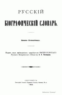 Русский биографический словарь (25 томов), в состав которого вошли имена и биографии виднейших деятелей государства, науки, просвещения и церковных деятелей, издавался Русским историческим обществом с 1896 по 1918 год. Русское историческое общество было основано в Санкт-Петербурге в 1866 году по инициативе известных отечественных историков, военных и государственных деятелей и ставило своей целью всесторонне содействовать развитию русского национального исторического просвещения. Общество пользовалось покровительством и финансовой поддержкой императорской семьи. Его деятельность носила археографический характер. Члены общества собирали исторические документы, которые публиковались в «Сборниках русского исторического общества». Всего до 1920 года (в этом году общество было закрыто) вышло 148 томов. Таким образом в научный оборот было введено большое количество документов XVIII – начала XIX века, ранее недоступных для исследователей, так как документальные материалы архивов царской России были для историков закрыты. К изданию русского биографического словаря, материалы которого до сих пор являются интереснейшим источником для исследователей, Общество приступило по инициативе императора Александра III. Тома биографического словаря выходили не в алфавитном порядке. С 1896 по 1909 год редактором словаря был руководитель Русского исторического общества, промышленник, член Сената Александр Александрович Половцев. Он выпустил 1, 2, 3, 6, 8, 12, 13, 14, 15, 18, 19, 21 и 22-й тома, поэтому этот словарь известен еще как «словарь Половцева».