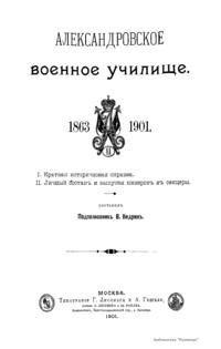 Истории Александровского военного училища посвящена изданная в 1901 г. книга военного историка В. Кедрина «Александровское военное училище 1863 - 1901». Данное издание содержит подробные сведения о деятельности училища, в нем дается оценка работе его руководителей (генерал-майора Б.А. Шванебаха, генерал-майора Свиты Его Императорского Величества М.П. Самохвалова, генерал-майора П.И. Мезенцова, генерал-майора П.Н Анчутина, генерал-лейтенанта И.М. Левачева) и его преподавательского состава, включая младших офицеров, отмечаются изменения в организации и в методиках обучения. В качестве приложения приводятся списки выпускников – кавалеров ордена Св. Георгия, погибших на полях сражений с описанием их подвигов, а также списки всех юнкеров и офицеров-выпускников училища.