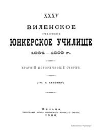 Краткий исторический очерк, посвященный 35-летию Виленскому пехотному юнкерскому училищу. Автор книги А. Антонов излагает подробные сведения о деятельности училища, отмечает изменения в организации и в методиках обучения. В качестве приложения даются списки начальников училища, командиров рот, делопроизводителей, младших офицеров-воспитателей, преподавателей, выпускников, а также сведения об офицерах, окончивших курс Виленского юнкерского училища.