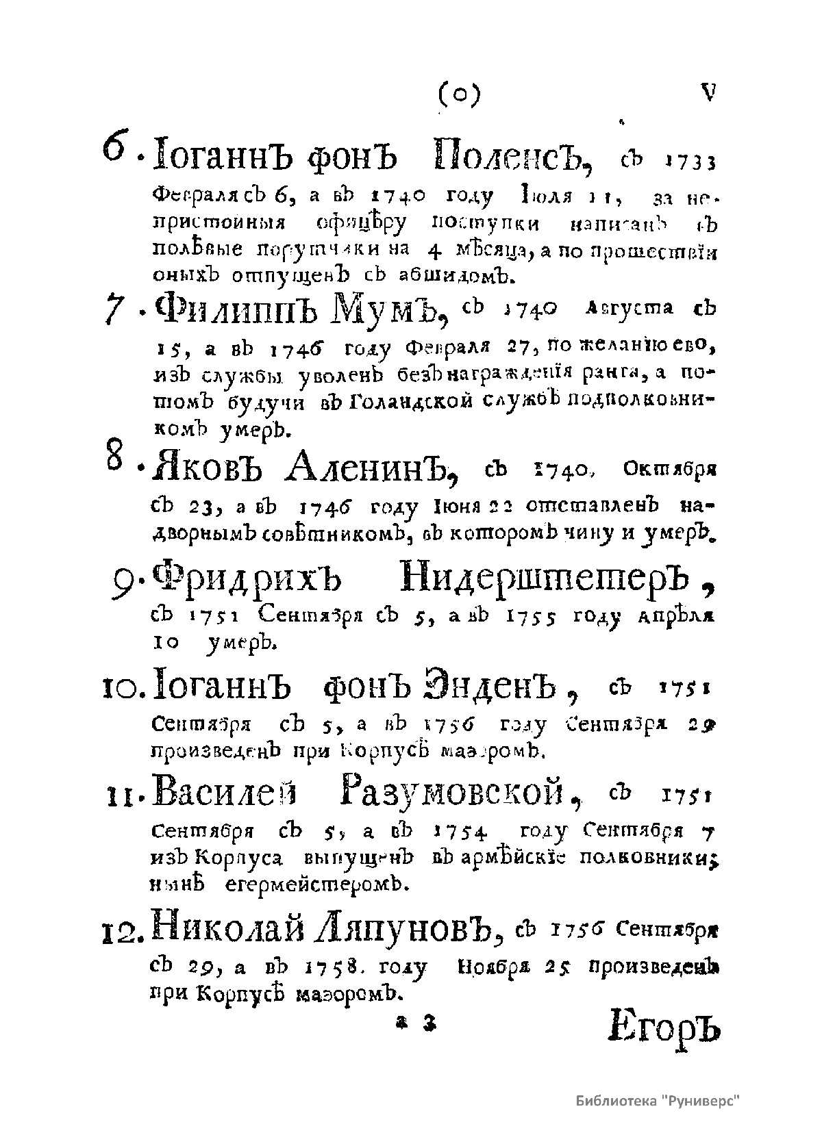 Список живущих и умерших на 1761 г. штаб- и обер-офицеров – руководителей, преподавателей и выпускников Сухопутного Шляхетского кадетского корпуса, а также обучающихся в тот период кадетов Корпуса с краткими личными характеристиками каждого. Список составлен и издан по приказу великого князя Петра Федоровича (будущего императора Петра III).