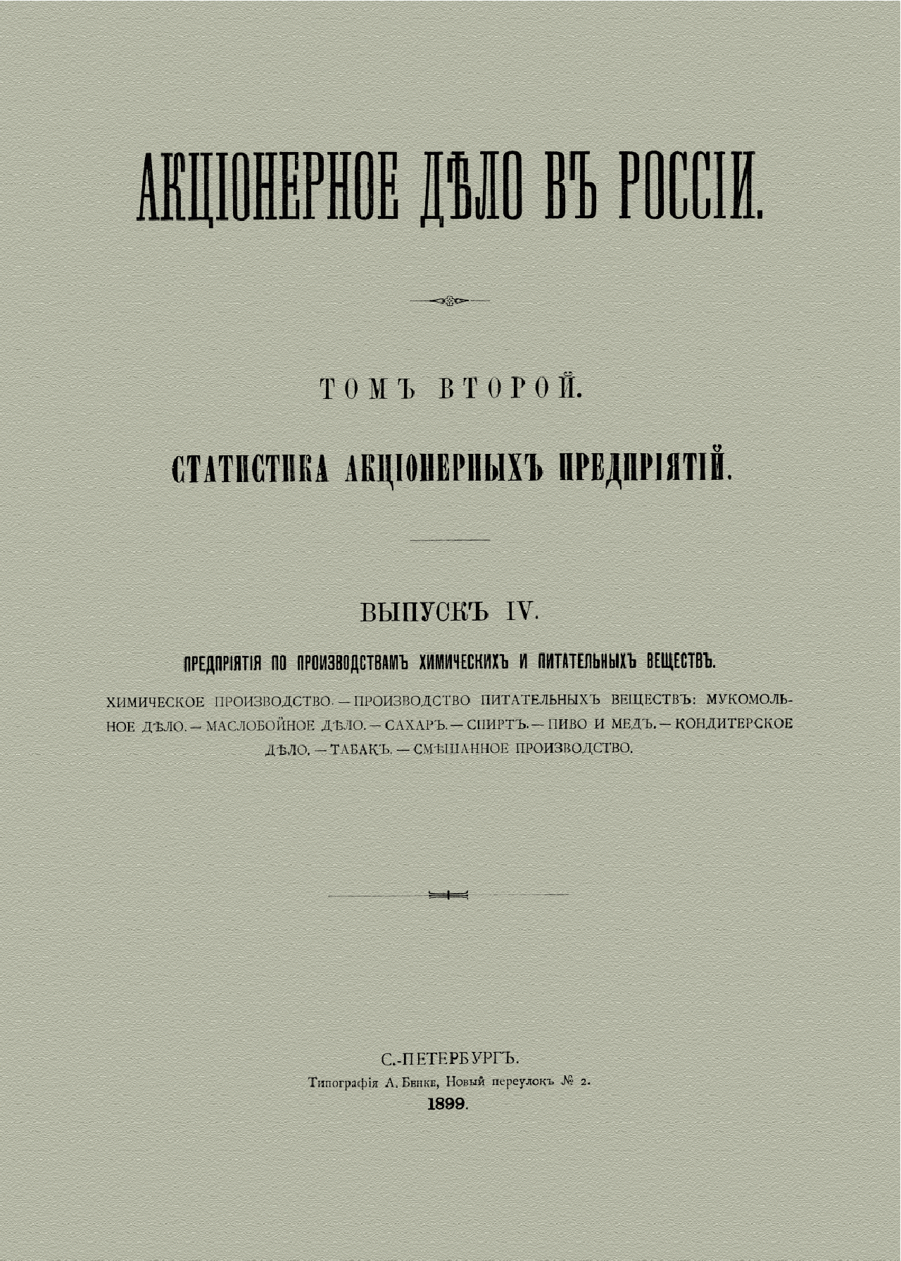 Работа над собранным в книге материалом началась в 1885-м и была завершена в 1894 году. Все предприятия акционерного типа, согласно утвержденным в 1885 году правилам об обложении допол-нительными сборами, были обязаны систематически оглашать результаты их деятельности. Эти же правила обязали казенные палаты сообщать редакции «Вестника финансов» списки всех обществ и товариществ, главные правления которых находятся в черте губерний, а также другие сведения. Таким образом, в основу книги вошли отчеты предприятий, печатавшиеся в «Вестнике финансов», в том виде, как их предоставляли предприятия для оглашения в печати. Помимо статистических сведений, собранных в семи выпусках второго тома, планировалось издать отельный труд (первый том) с общими выводами и историческим очерком возникновения и развития акционерного дела в России.