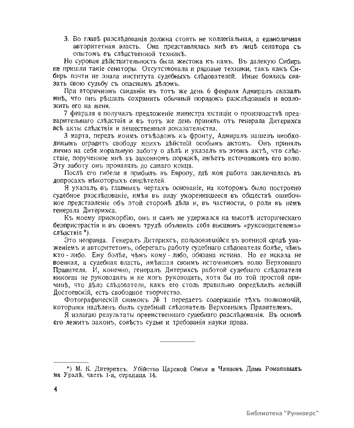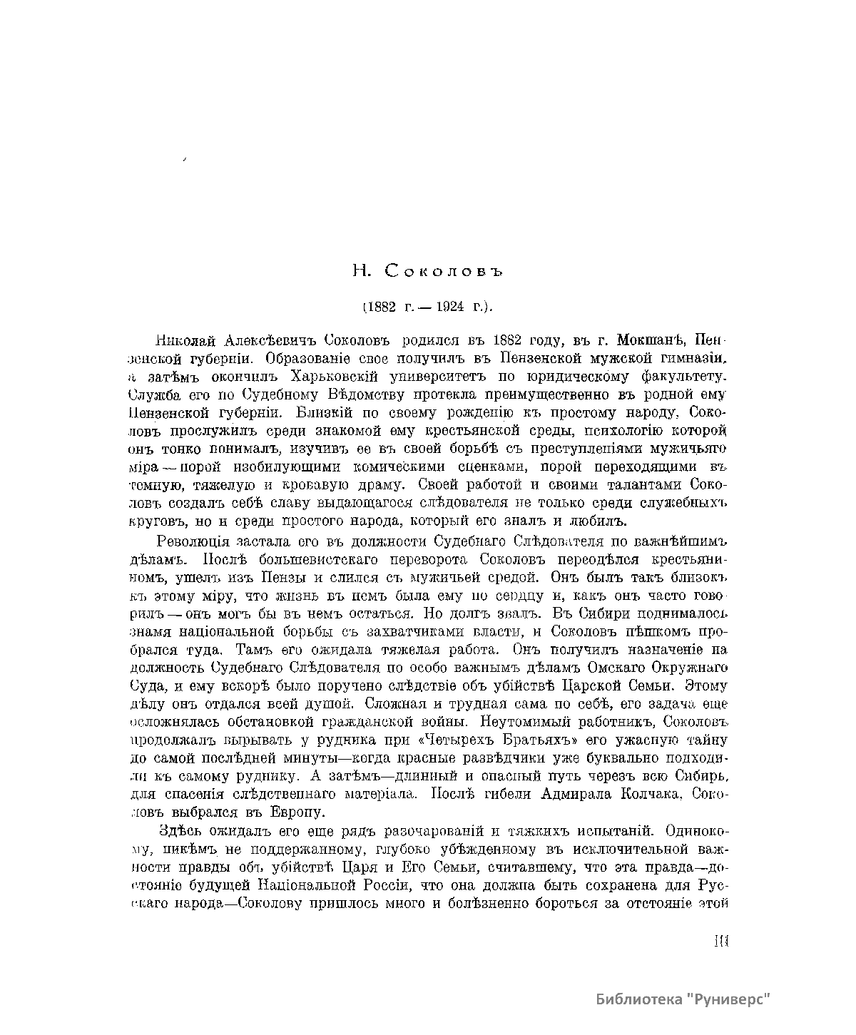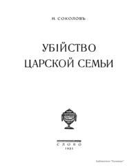 В настоящей книге, изданной в 1925 г. в Берлине, следователь по особо важным делам Омского окружного суда Николай Алексеевич Соколов опубликовал целый комплекс документов о гибели императора Николая II и его семьи. Следователь Соколов оказался первым, кто сумел с известной полнотой ответить на вопрос, который являлся десятки лет одной из самых охраняемых тайн советского государства. По его словам, он в пределах права «старался делать все возможное, чтобы найти истину и соблюсти ее для будущих поколений». Он понимал, что «личность потерпевшего и реальная действительность, в условиях которой совершилось преступление, придают ему особый характер – явления исторического». Свидетельства Соколова на долгие годы явились непререкаемым авторитетом в деле о гибели императора и его семьи. В начале 2000-х годов специалисты Генеральной прокуратуры довели до конца расследование екатеринбургской трагедии. Они собрали и проанализировали сотни документов, свидетельских показаний и, главное, нашли и идентифицировали останки императора, его семьи и приближенных. Следствие, начатое летом 1918 г., завершено почти через сто лет.