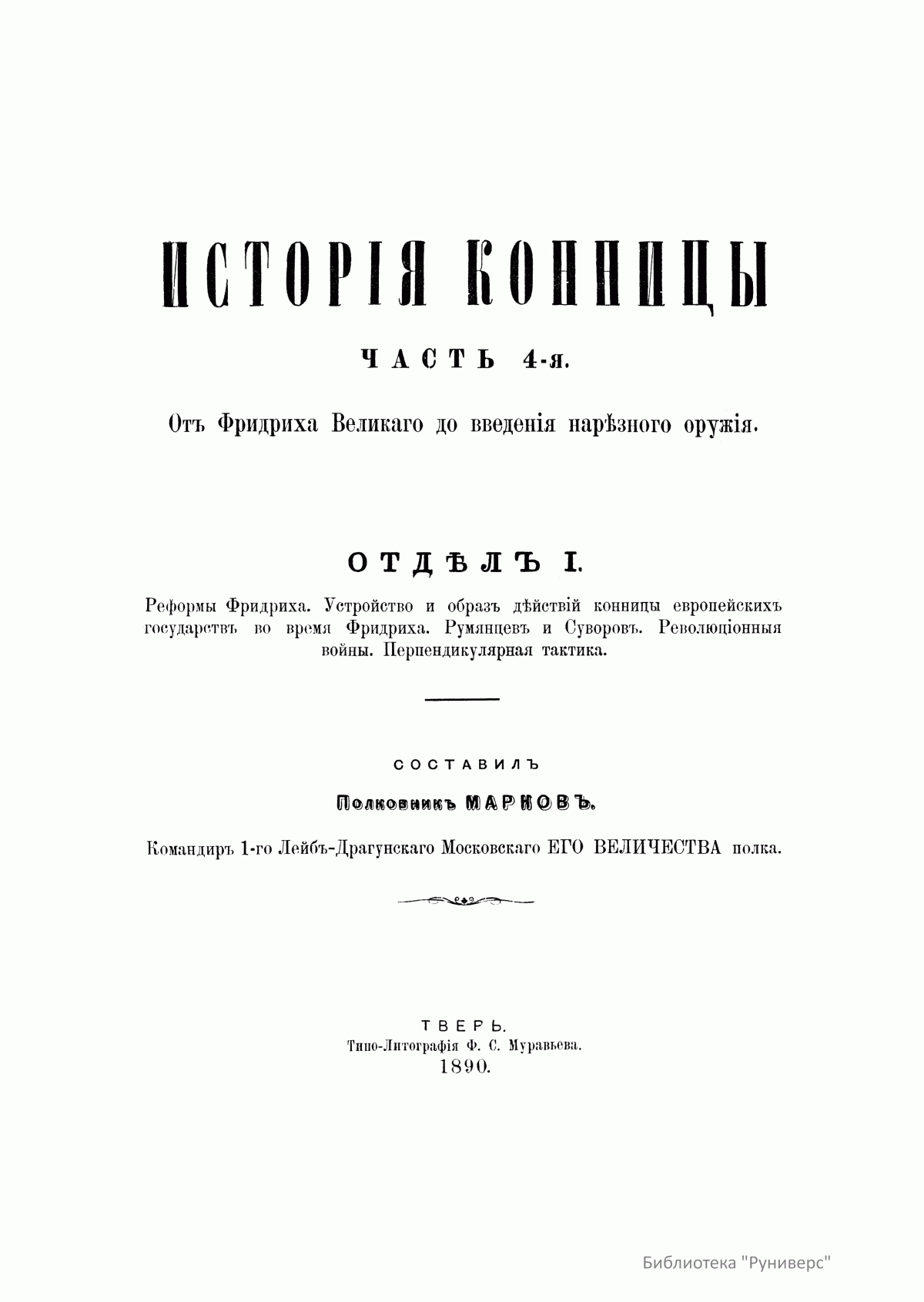 Труд по истории конницы М. И. Маркова, командира 1-го лейб-драгунского Московского его величества полка, изданный в конце XIX века в пяти томах, сегодня признан безусловной библиографической редкостью. Капитальная монография, уникальная по объему собранного материала, написана занимательным, живым языком. Издание охватывает обширный и разнообразный по своему составу материал. Изучение конницы ведется со времен ее возникновения в Древней Греции; затем рассмотрено дальнейшее развитие конных войск в Римской империи, в средневековых государствах Европы и Азии. Особенно пристальное внимание автор уделил кавалерии России от ее возникновения до детального разбора действий русской конницы во время Балканской войны 1877–1878 гг. На страницах монографии рассмотрено огромное количество сражений и битв различных государств и эпох, приведены выводы автора об устройстве конницы минувших столетий. Текст сопровождают многочисленные иллюстрации, изображающие породы и окрасы лошадей, формы обмундирования и вооружения всадников, портреты знаменитых полководцев и государственных деятелей, а также схемы и карты сражений.