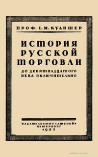 Научный труд профессора И. М. Кулишера «Очерк истории русской торговли» вышел в 1923 г. в Петербурге в издательстве «Атеней». В книге подробно исследуется развитие торговли в России с древнейших времен до начала XX столетия. Автор использовал литературу по русской истории, истории права и истории торговли, многочисленные отечественные и иностранные источники. Ссылаясь на собственные «Лекции по истории экономического быта Западной Европы» шестого издания, он проводил параллели между развитием русской торговли и торговли в иностранных государствах. Все сочинение разбито на соответствующие эпохи. Ученый за начало исследования взял VIII век — время появления на Руси куфических монет, завершается труд разбором договоров и трактатов внешней торговли конца XIX – начала XX века.
