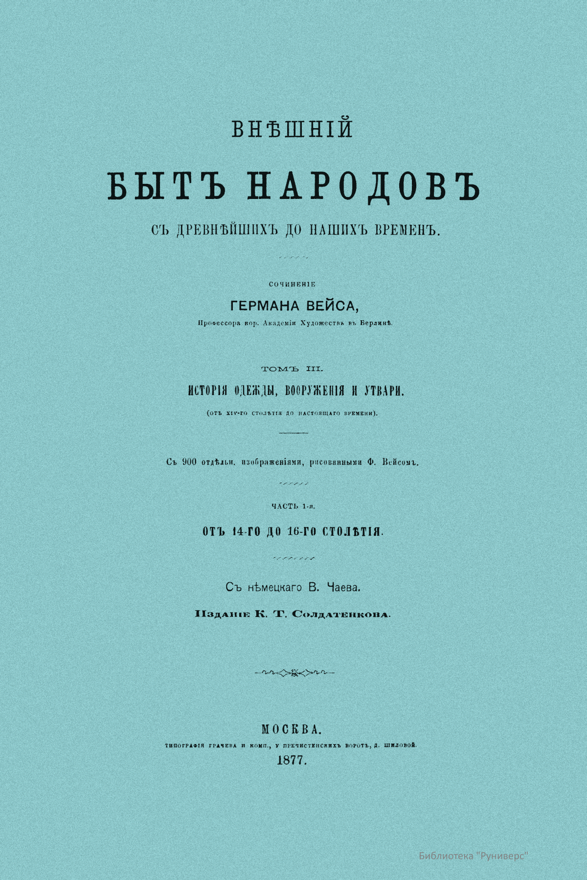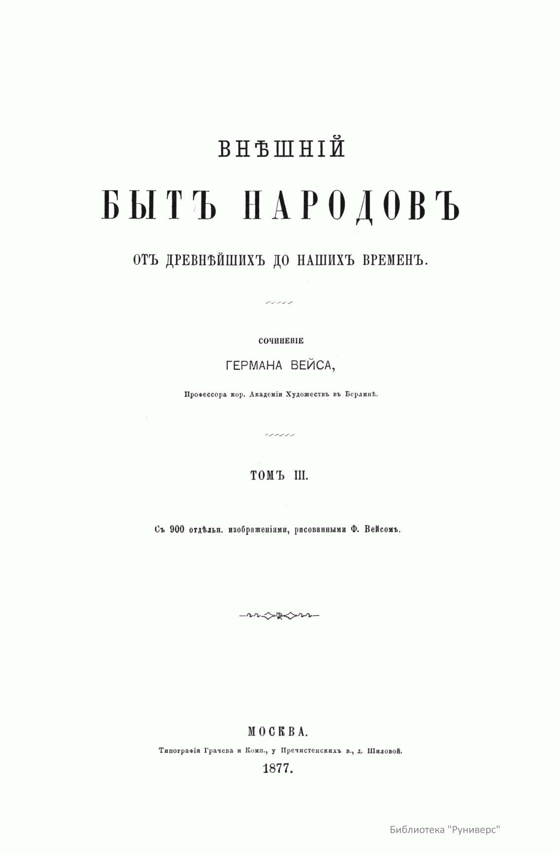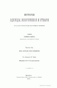 Сочинение Германа Вейса, профессора и преподавателя Берлинской Академии художеств, адресовано прежде всего художникам, а также всем интересующимся историей культуры разных народов. Книга состоит из трех частей. Первый том посвящен древнему миру (Часть первая – восточные народы: древние народы Африки (египтяне, эфиопяне), древние народы Азии (аравитяне, народы западной Азии, ассирияне и вавилоняне, мидяне и персы, евреи и финикияне, малоазийские народы, индусы, Китай). Часть вторая – западные народы: древнейшие народы Европы (народы северовосточной Европы, народы европейской Сарматии, народы северной, средней и западной Европы, народы Испании, народы Греции, народы Италии). Второй том посвящен средним векам до начала XIV столетия (Часть первая – Византия и Восток. Часть вторая – европейские народы). Третий том продолжен до второй половины XIX века (Часть первая – от XIV до XVI столетия. Часть вторая – с XVI столетия). Все содержание внешнего быта автор распределяет по трем рубрикам: одежда и вооружение, постройки, утварь (постройки рассматриваются только в первом томе, одежда и вооружение в немецком языке определяются одним словом, которому нет аналога в русском, – die Tracht). Автор придает своим рубрикам очень широкий объем. В первую рубрику кроме вооружения вместе с уборами и украшениями входит и убранство волос, и косметические средства. Вторая, «постройки», охватывает не только всякого рода здания, но и мосты, дороги, каналы, судостроение, военный стан – все то, к чему можно приложить понятие «постройки». Еще шире третья рубрика – «утварь». В нее входят боевые колесницы, осадные машины, сосуды, мебель, храмовая утварь, музыкальные инструменты, игральные приборы и пр. В книге представлены копии рисунков, сделанных автором с самых лучших и достоверных источников без малейших отступлений.
