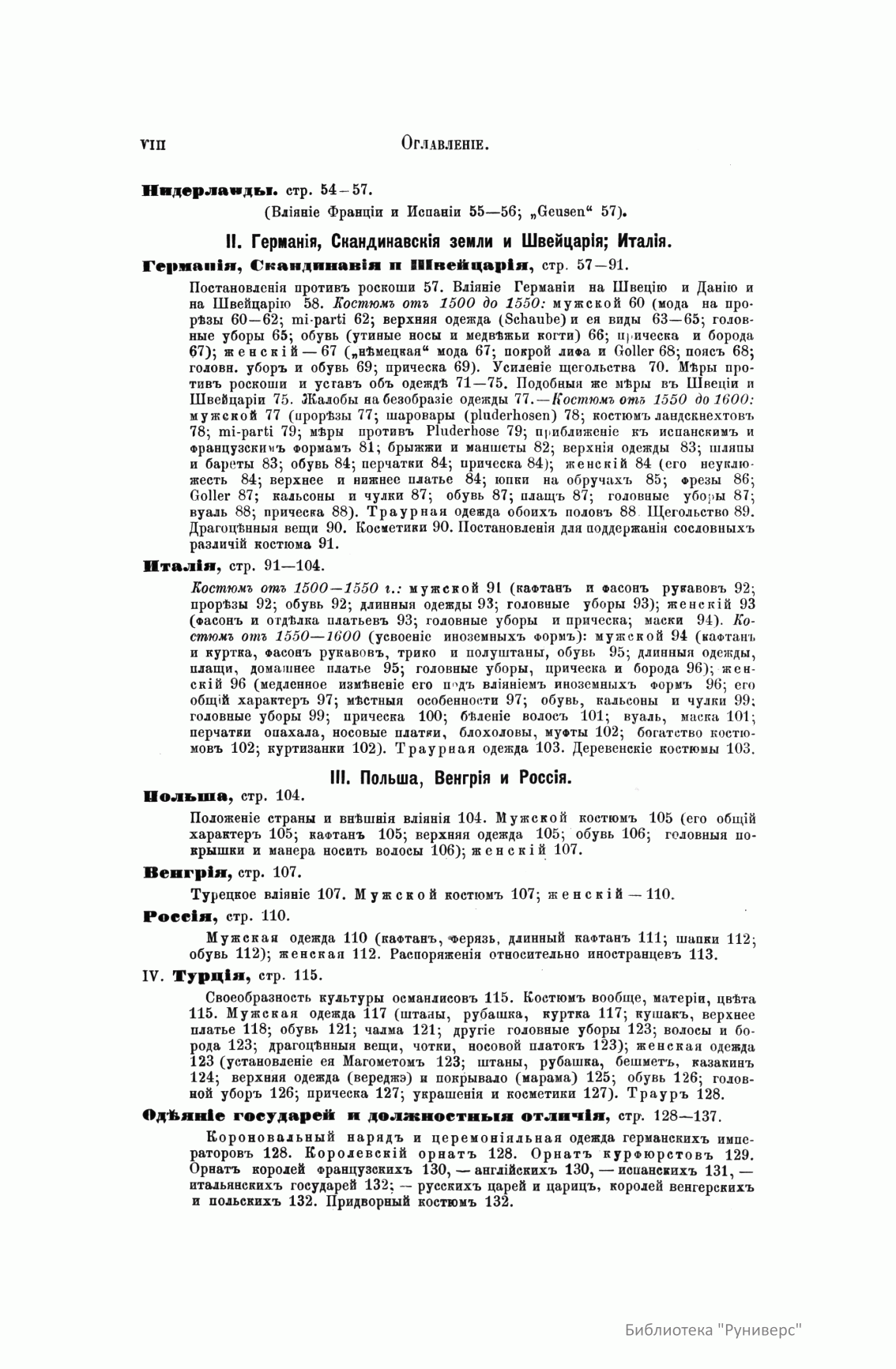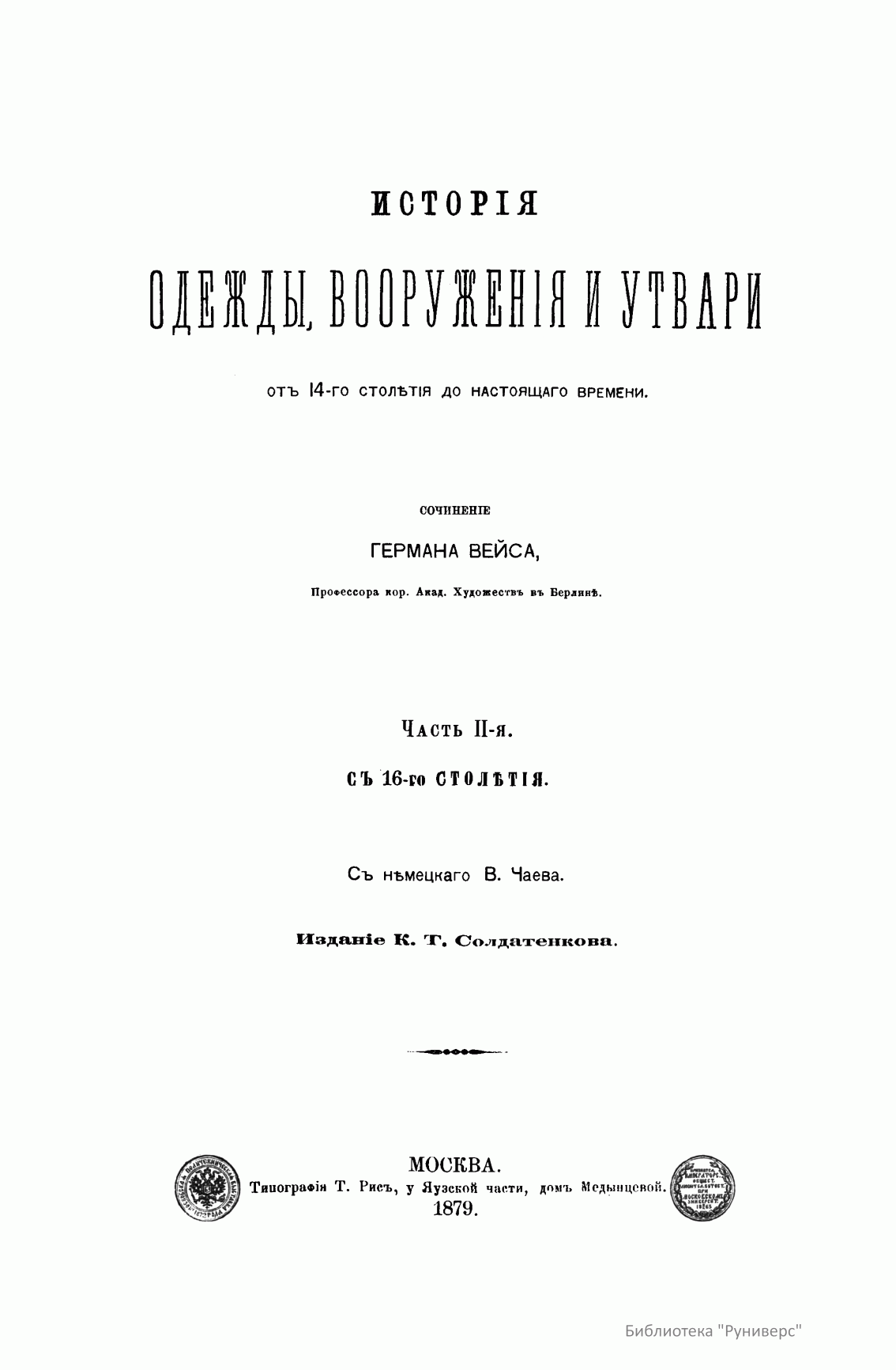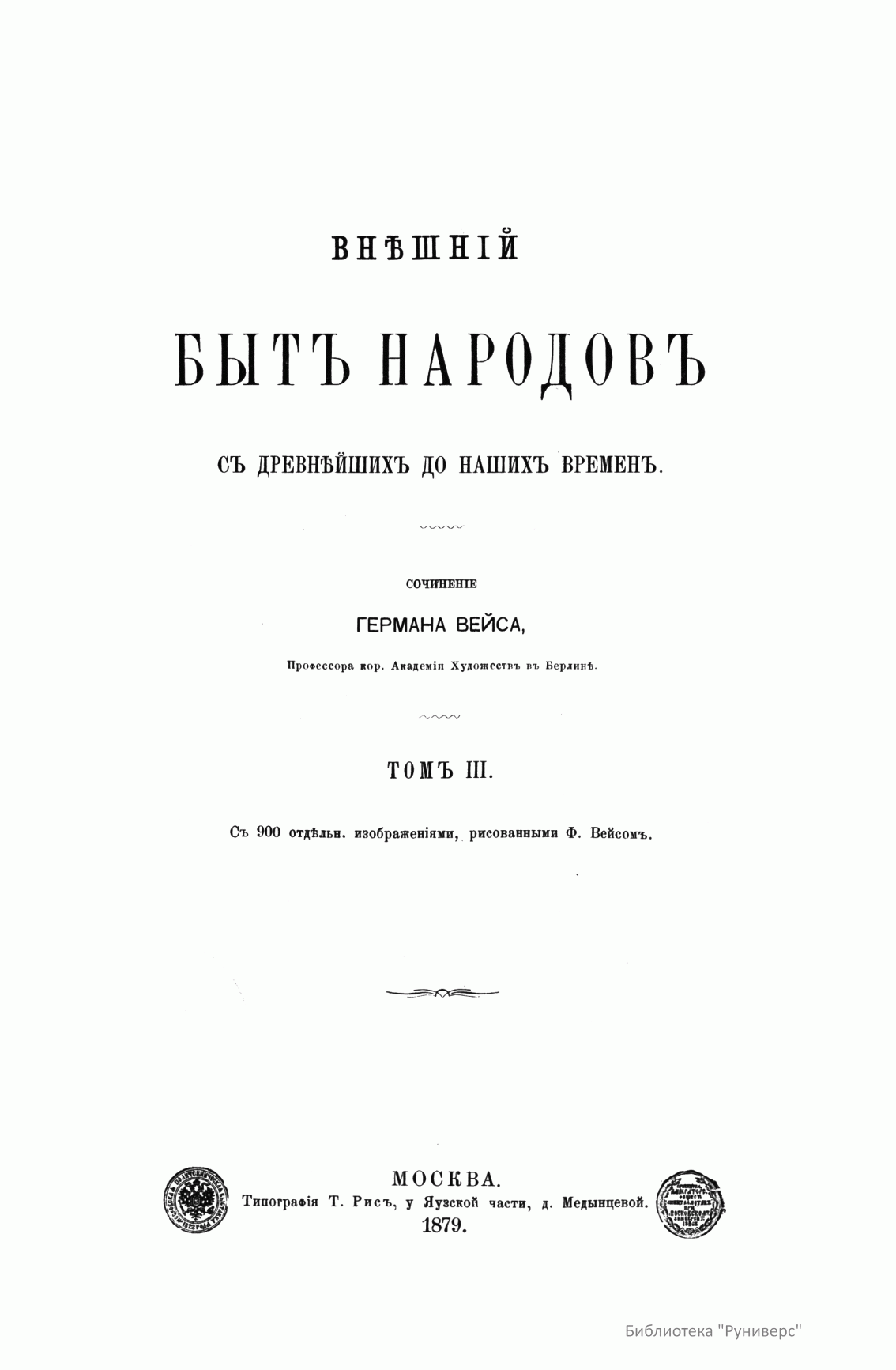 Сочинение Германа Вейса, профессора и преподавателя Берлинской Академии художеств, адресовано прежде всего художникам, а также всем интересующимся историей культуры разных народов. Книга состоит из трех частей. Первый том посвящен древнему миру (Часть первая – восточные народы: древние народы Африки (египтяне, эфиопяне), древние народы Азии (аравитяне, народы западной Азии, ассирияне и вавилоняне, мидяне и персы, евреи и финикияне, малоазийские народы, индусы, Китай). Часть вторая – западные народы: древнейшие народы Европы (народы северовосточной Европы, народы европейской Сарматии, народы северной, средней и западной Европы, народы Испании, народы Греции, народы Италии). Второй том посвящен средним векам до начала XIV столетия (Часть первая – Византия и Восток. Часть вторая – европейские народы). Третий том продолжен до второй половины XIX века (Часть первая – от XIV до XVI столетия. Часть вторая – с XVI столетия). Все содержание внешнего быта автор распределяет по трем рубрикам: одежда и вооружение, постройки, утварь (постройки рассматриваются только в первом томе, одежда и вооружение в немецком языке определяются одним словом, которому нет аналога в русском, – die Tracht). Автор придает своим рубрикам очень широкий объем. В первую рубрику кроме вооружения вместе с уборами и украшениями входит и убранство волос, и косметические средства. Вторая, «постройки», охватывает не только всякого рода здания, но и мосты, дороги, каналы, судостроение, военный стан – все то, к чему можно приложить понятие «постройки». Еще шире третья рубрика – «утварь». В нее входят боевые колесницы, осадные машины, сосуды, мебель, храмовая утварь, музыкальные инструменты, игральные приборы и пр. В книге представлены копии рисунков, сделанных автором с самых лучших и достоверных источников без малейших отступлений.