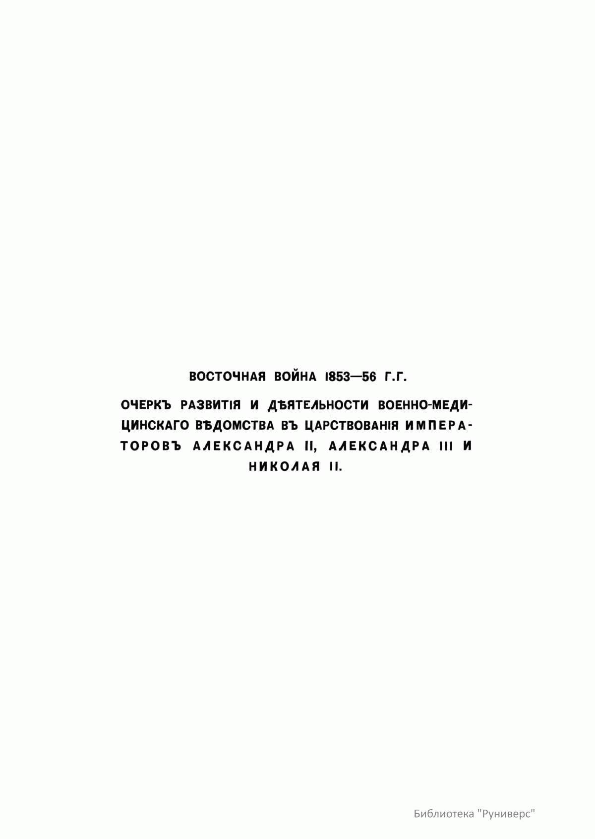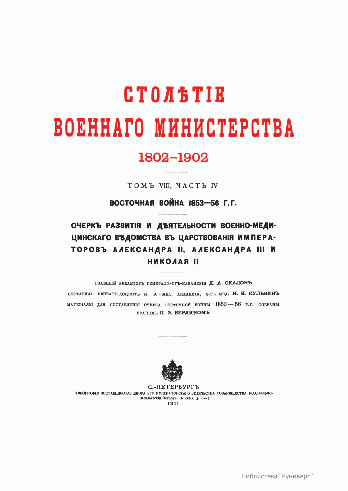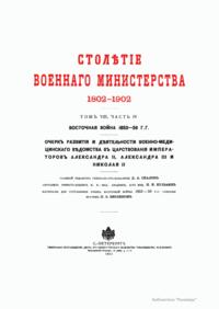 Столѣтiе военнаго министерства. 1802-1902. Восточная война 1853-56 гг. Очеркъ развитiя и дѣятельности военно-медицинскаго вѣдомства въ царствованiя Императоровъ Александра II, Александра III и Николая II
