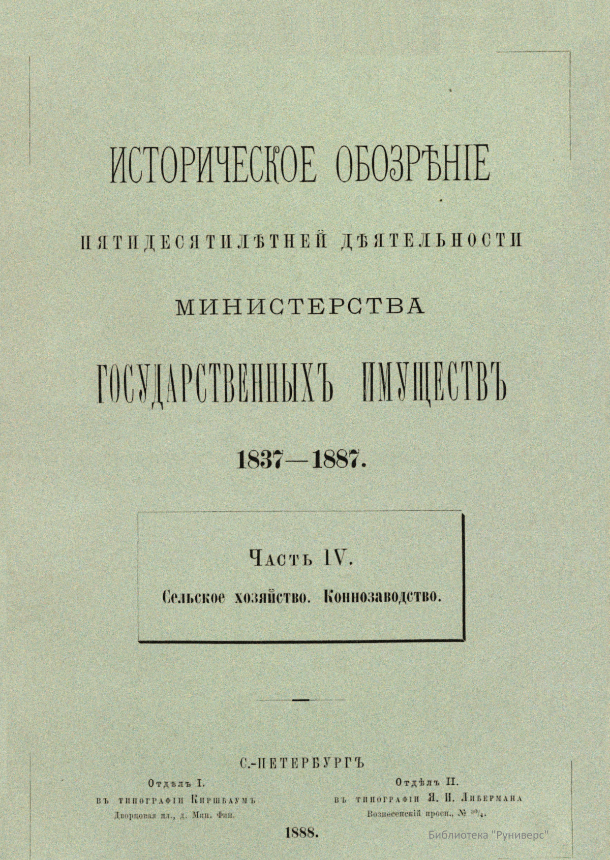 Историческое обозрѣнiе пятидесятилѣтней дѣятельности министертва государственныхъ имуществъ. 1837-1887. Часть IV. Сельское хозяйство. Коннозаводство