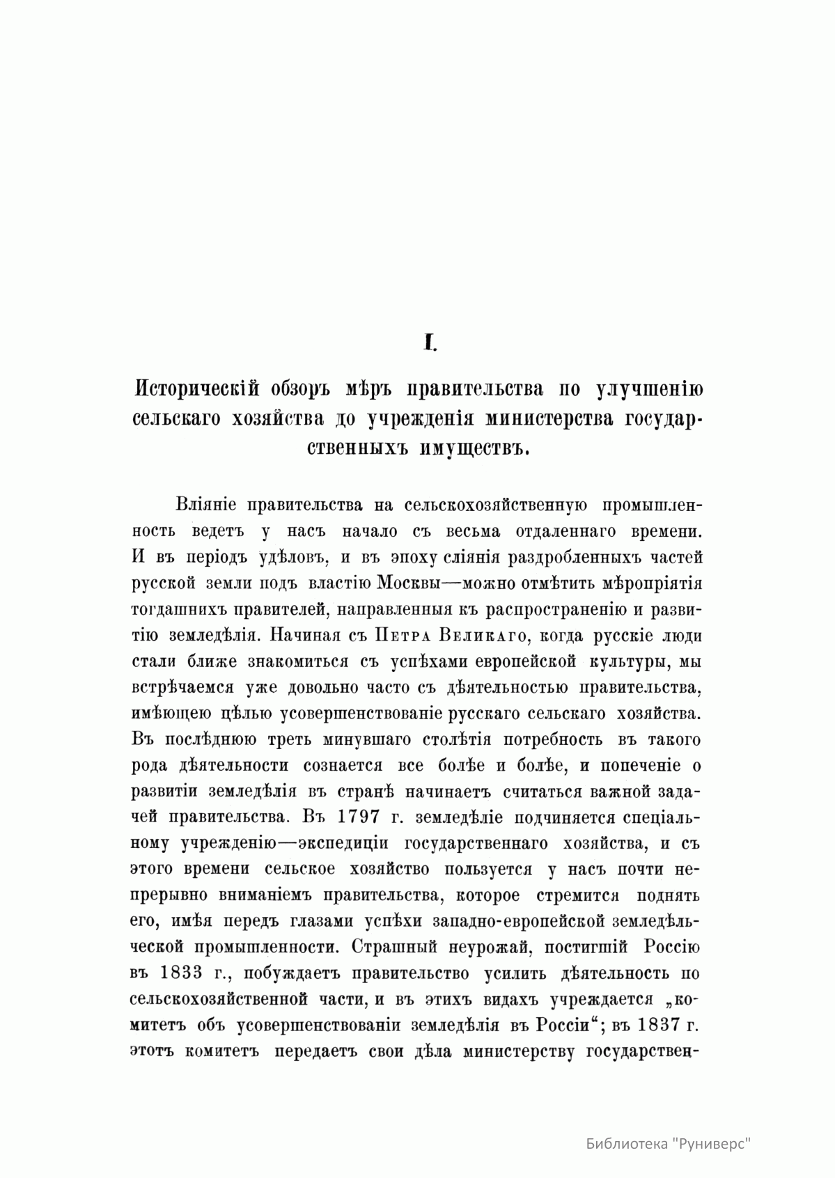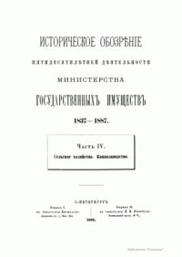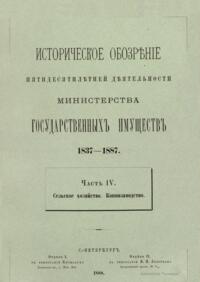 Министерство государственных имуществ возникло в 1837 г. по воле императора Николая I. Главная задача министерства заключалась в установлении попечительства над государственными крестьянами и лучшее устройство государственного имущества, то есть казенных земель и лесов, которые с 1811 г. вместе с казенными крестьянами состояли в ведении министерства финансов по департаменту государственных имуществ. Под влиянием неурожаев начала 30-х годов министерству было поручено также заведывание всеми делами, относящимися к усовершенствованию сельского хозяйства. В 1874 г. из министерства финансов министерству государственных имуществ передано горное дело. В ведении этого министерства два раза, с 1848-го по 1856-й и с1874-го по 1881 гг., находилось государственное коннозаводство. «Историческое обозрение пятидесятилетней деятельности Министерства государственных имуществ» (1837 – 1887) знакомит читателя с главными результатами деятельности этой организации. «Обозрение» разделено на пять частей. Первая часть посвящена учреждению Министерства государственных имуществ и преобразованиям, которым оно подвергалось с 1837-го до 1887 г. Вторая часть состоит из двух отделов: в первом излагаются главные результаты попечительства министерства над свободными сельскими жителями, во втором – результаты поземельного устройства государственных крестьян. Третья часть также разделена на два отдела: в первом излагаются результаты управления казенными землями и оброчными статьями, во втором – результаты управления казенными лесами. Четвертая часть также включает два отдела: первый отдел посвящен результатам заведования министерством сельскохозяйственной частью, второй – управлению государственным коннозаводством. В пятой части излагаются результаты заведывания горным делом. Главными материалами для «Обозрения» кроме текущих и архивных дел министерства послужили всеподданнейшие отчеты министров государственных имуществ, а также некоторые печатные источники.