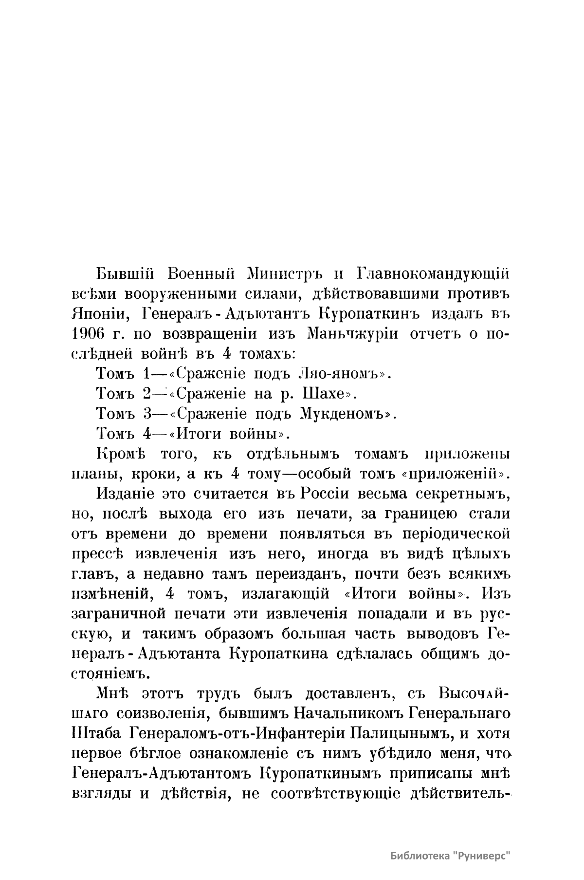 В книге русский государственный деятель Витте С.Ю. полемизирует с генерал-адъютантом Куропаткиным по поводу отчета последнего о русско-японской войне 1904 – 1905 гг. Военный министр и главнокомандующий всеми вооруженными силами, действовавшими против Японии, генерал-адъютант Куропаткин в 1906 г. издал отчет о войне в четырех томах. Первые три тома посвящены сражениям: под Ляояном, на р. Шахе, под Мукденом. В четвертом томе подведены итоги войны. Именно четвертый том Витте выбрал объектом своего исследования, так как, по его мнению, именно в нем содержатся неправильные выводы и предположения. Витте считает их односторонними и даже пристрастными. Автор не стремится исправить все допущенные ошибки, а выясняет наиболее существенные погрешности и дает ряд примеров того, насколько сильно расходится изложения автора с фактами. Русско-японская война 1904 – 1905 гг. – война за контроль в Северо-Восточном Китае и Корее. Начата Японией. Основные события 1904 г.: нападение японского флота на Порт-Артур, оборона Порт-Артура, неудачные для России сражения на р. Ялу, Ляоянское, на р. Шахе. Основные события 1905 г.: поражение русской армии при Мукдене, флота – при Цусиме. Война завершилась Портсмутским мирным договором, зафиксировавшим уступку Россией Японии южной части Сахалина и своих арендных прав на Ляодунский полуостров и Южно-Маньчжурскую железную дорогу.