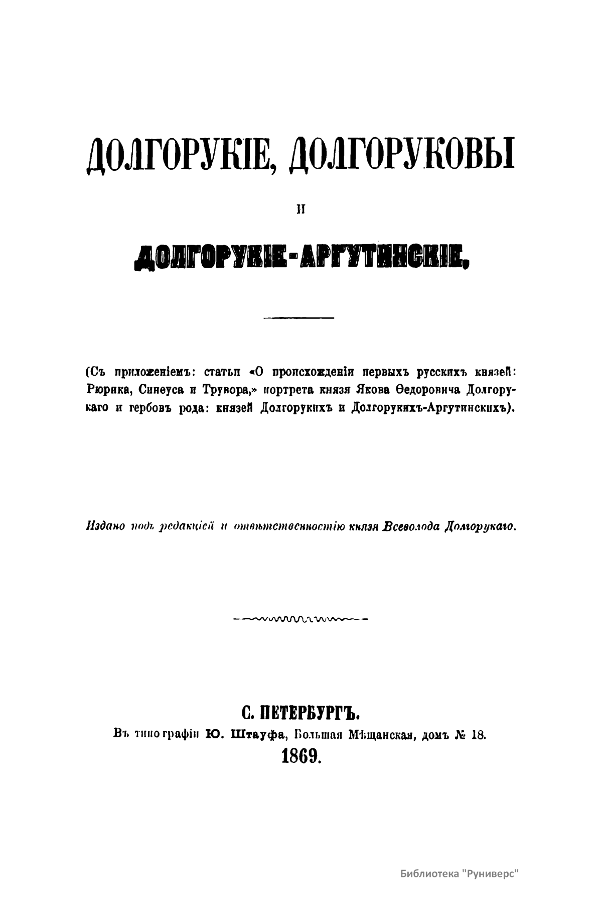 В библиотеке «Руниверс» представлена первая часть книги «Долгорукие, Долгоруковы и Долгорукие-Аргутинские». Цель этой части – познакомить читателя с родом князей Долгоруких. Издатель книги, князь Всеволод Долгорукой, представляет не строгое научное исследование, а рассказ о первой линии князей Долгоруких, но основанный на исторических данных. Настоящее сочинение имеет цель также опровергнуть мнение князя Петра Владимирович Долгорукова о том, что фамилию нужно писать через «ов», а не через «ой». Первая часть книги – сочинение князя Алексея Долгорукого и Натальи Шпилевской, заключает главы: О роде. Из дела о гербе и подписи Долгоруких. История рода Долгоруких. В «Приложении» представлен список старшей линии князей Долгоруких; список дочерей князей первой линии; список супруг князей Долгоруких старшей (первой) линии. Первую часть заключает статья князя Алексея Долгорукого «Заметки о первых русских князьях и о происхождении Рюрика, Синеуса и Трувора».