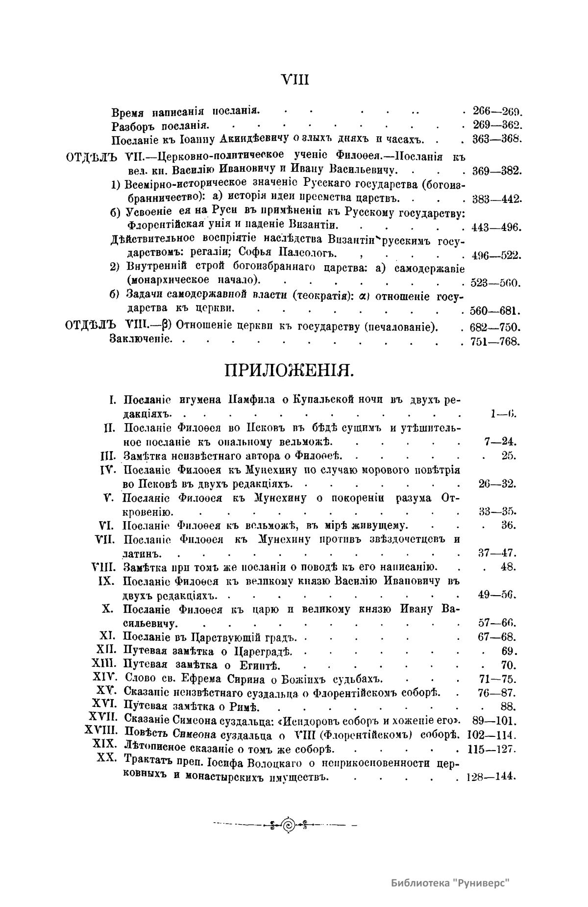 Филофей – инок-писатель (1465 – 1542), который в силу обстоятельств и по личному почину обращается к великим князьям московским то с печалованием за опальных, то по существенным вопросам государственной и общественной жизни своего времени. Задача настоящего исследования – понять и объяснить личность Филофея и его литературную деятельность. В исследовании восемь частей. Первая посвящена выяснению данных биографии Филофея. Вторая – библиографии предмета. Третья – краткой истории и выяснению причин и условий возникновения и развития типа учительного инока в Древней Руси и судьбе этого типа в стенах Елеазарова монастыря. В четвертой части речь идет об отличительных особенностях авторства и сочинений Филофея, связи этих особенностей с историческими условиями древнерусской образованности и литературы, о господствующей идее мировоззрения Филофея и его сочинений, и, как первоисточник и основа этой идеи, излагается библейское учение о Промысле Божием. Пятая часть посвящена исследованию посланий Филофея, в которых идея провиденциализма, как господствующая идея его посланий, раскрывается им в отношении к судьбам отдельных людей. В шестой части рассматриваются те послания Филофея, в которых та же идея раскрывается в связи с учением астрологов о влиянии звезд на судьбы мира, людей и царств. В седьмой части рассматриваются послания к князьям, где речь идет о всемирно-историческом значении русского государства и отношении государства к церкви. В восьмой части излагается взгляд Филофея на печалование как форму отношения церкви к государству. Подробное оглавление находится в начале книги.