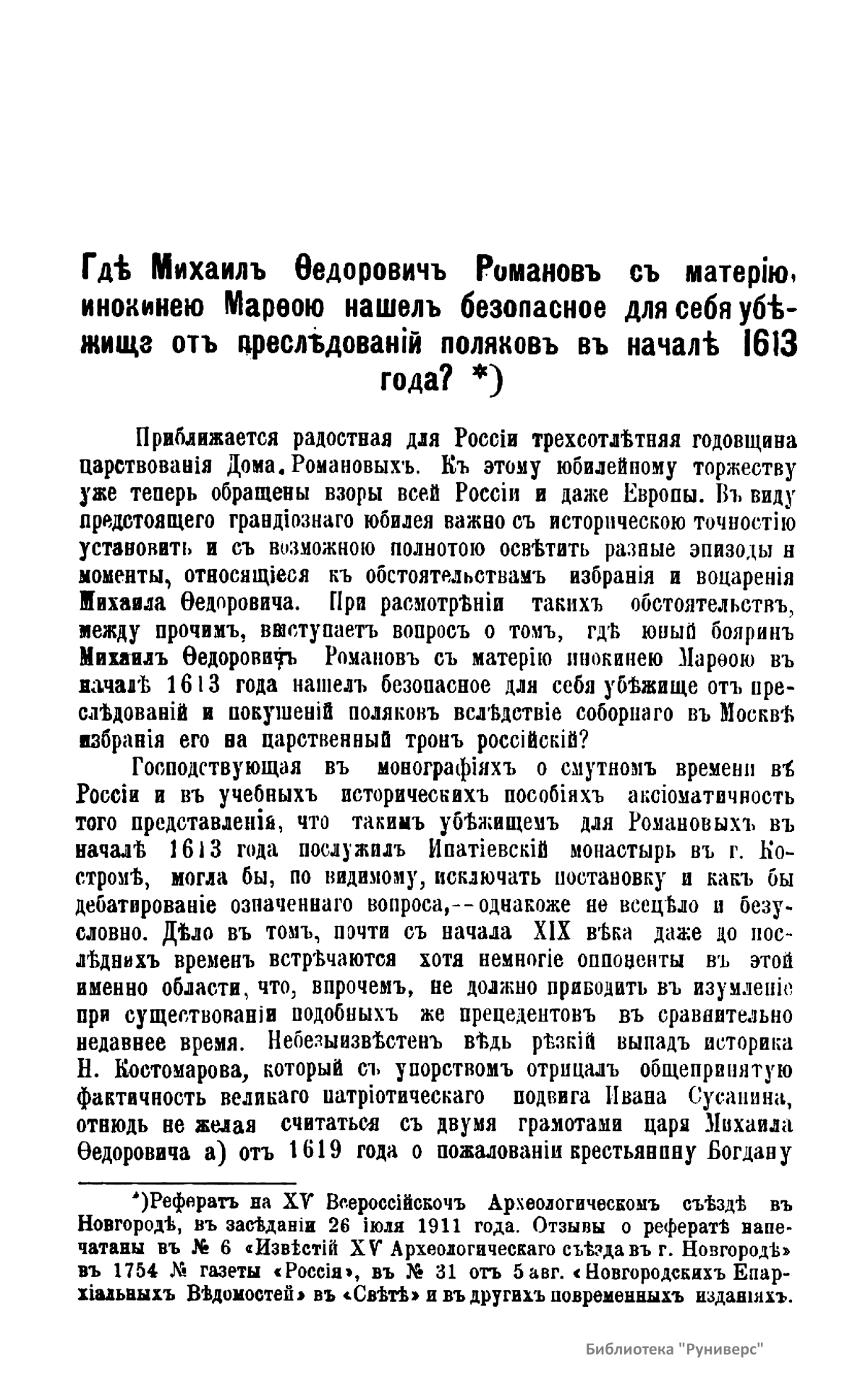 Романовы – боярский род в России XIV – XVI вв., потомки выходца из Литвы Андрея Кобылы. До начала XVI в. именовались Кошкиными, до конца XVI в. – Захарьиными. С 1613 г. царская, с 1721 г. – императорская династия. Михаил Федорович – первый царь из рода Романовых. Настоящее издание подготовлено к трехсотлетней годовщине царствования Дома Романовых. Издатель считает необходимым к предстоящему юбилею установить с исторической точностью разные эпизоды, относящиеся к обстоятельствам избрания и воцарения Михаила Федоровича, и, в частности, проясняет вопрос, где Михаил Федорович Романов с матерью инокинею Марфою нашел безопасное для себя убежище от преследований поляков в начале 1613 года.
