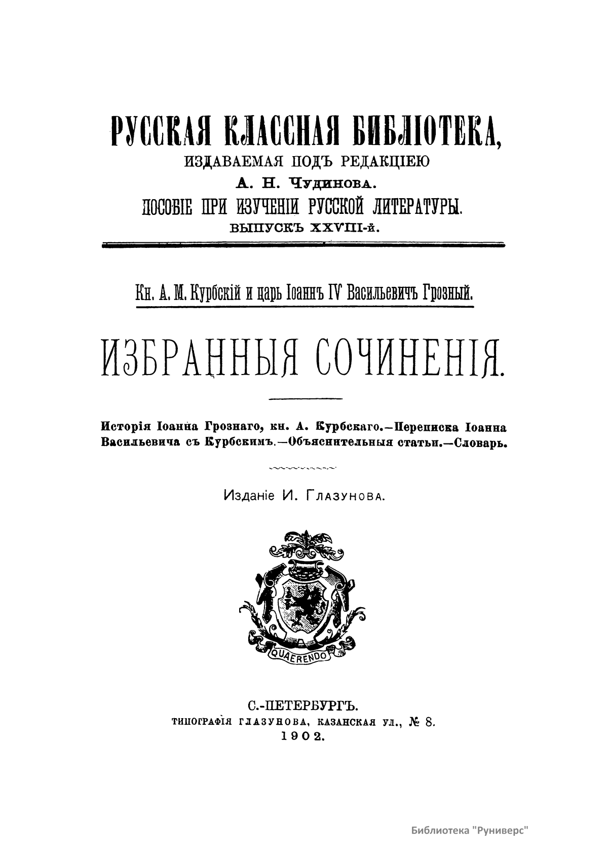 Кн. А.М. Курбскiй и царь Iоанн IV Васильевичъ Грозный. Избранныя сочиненiя