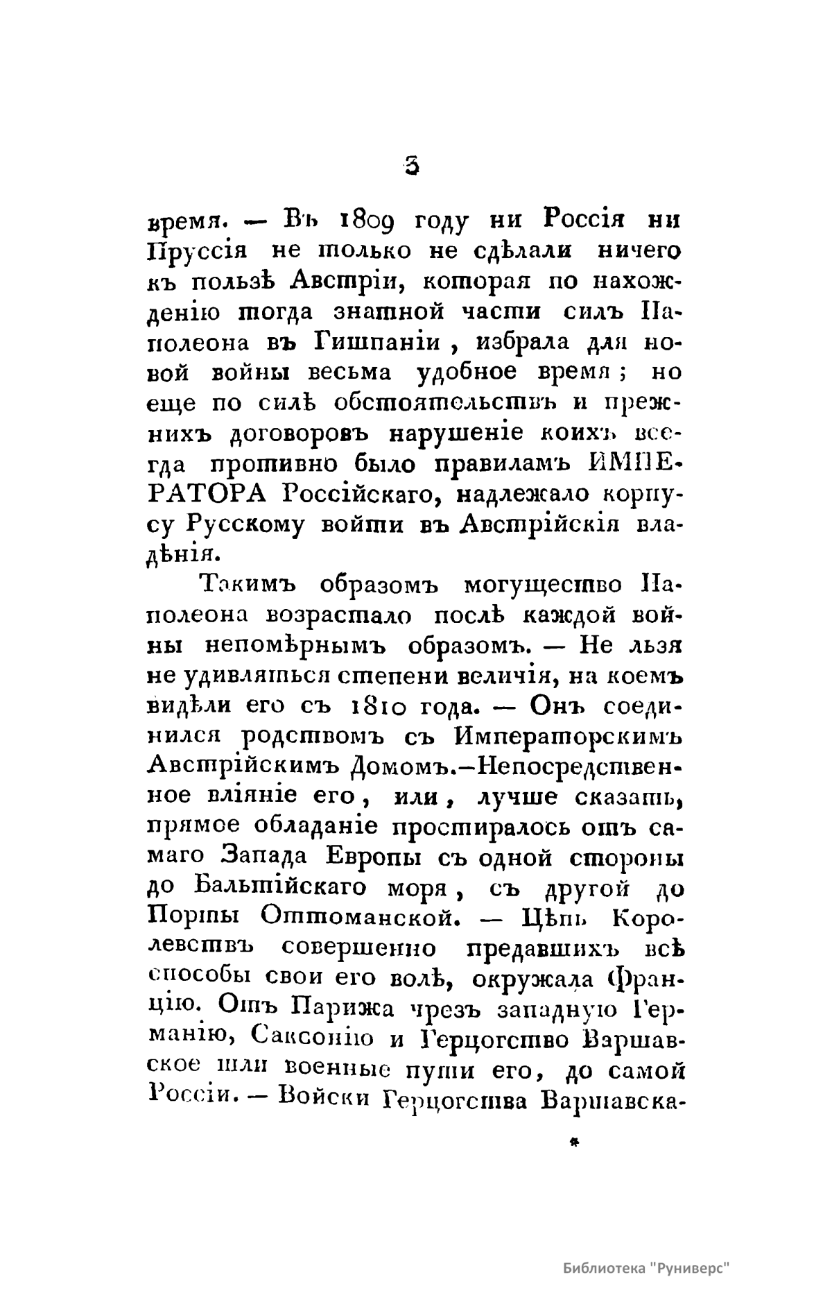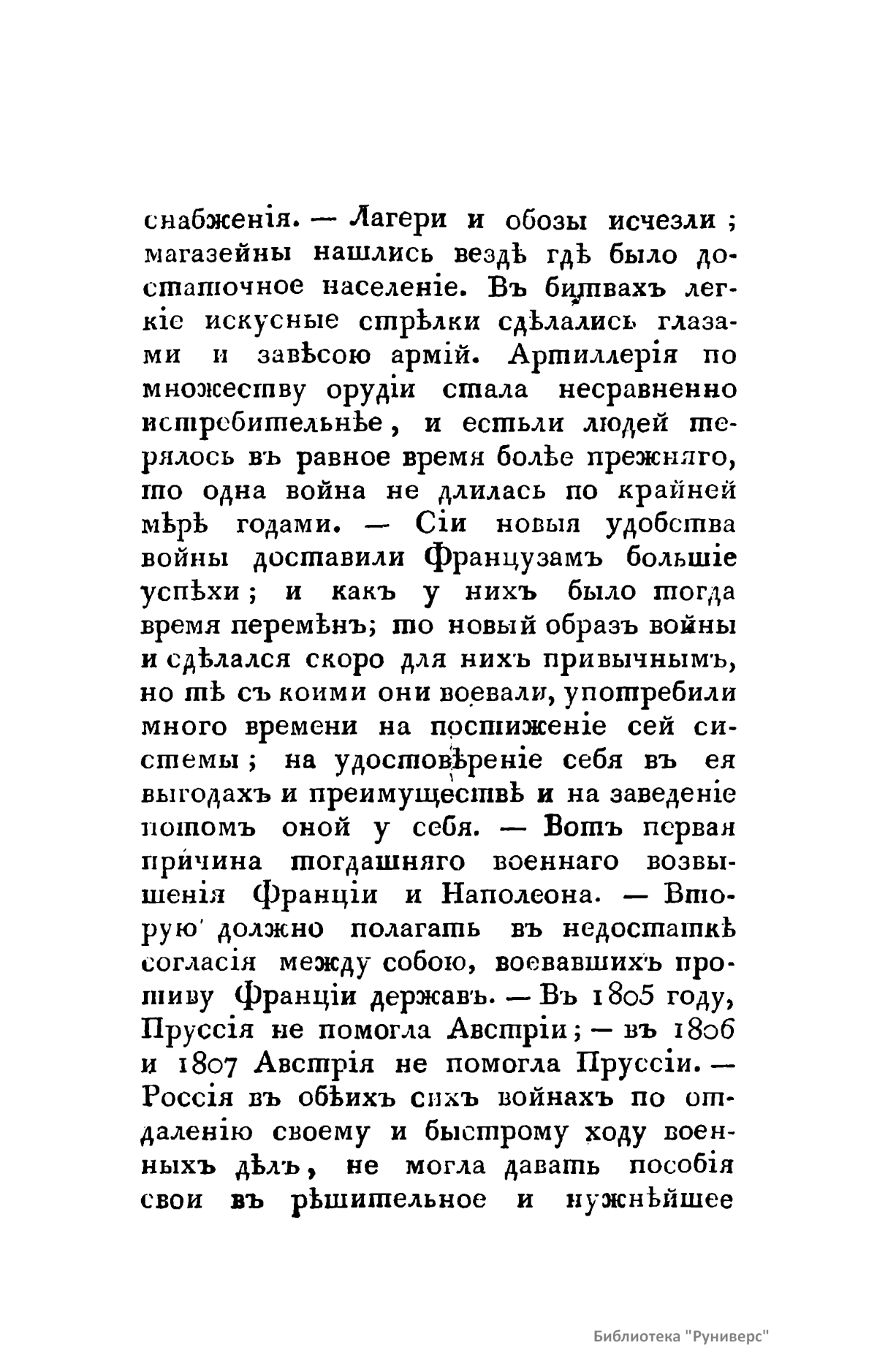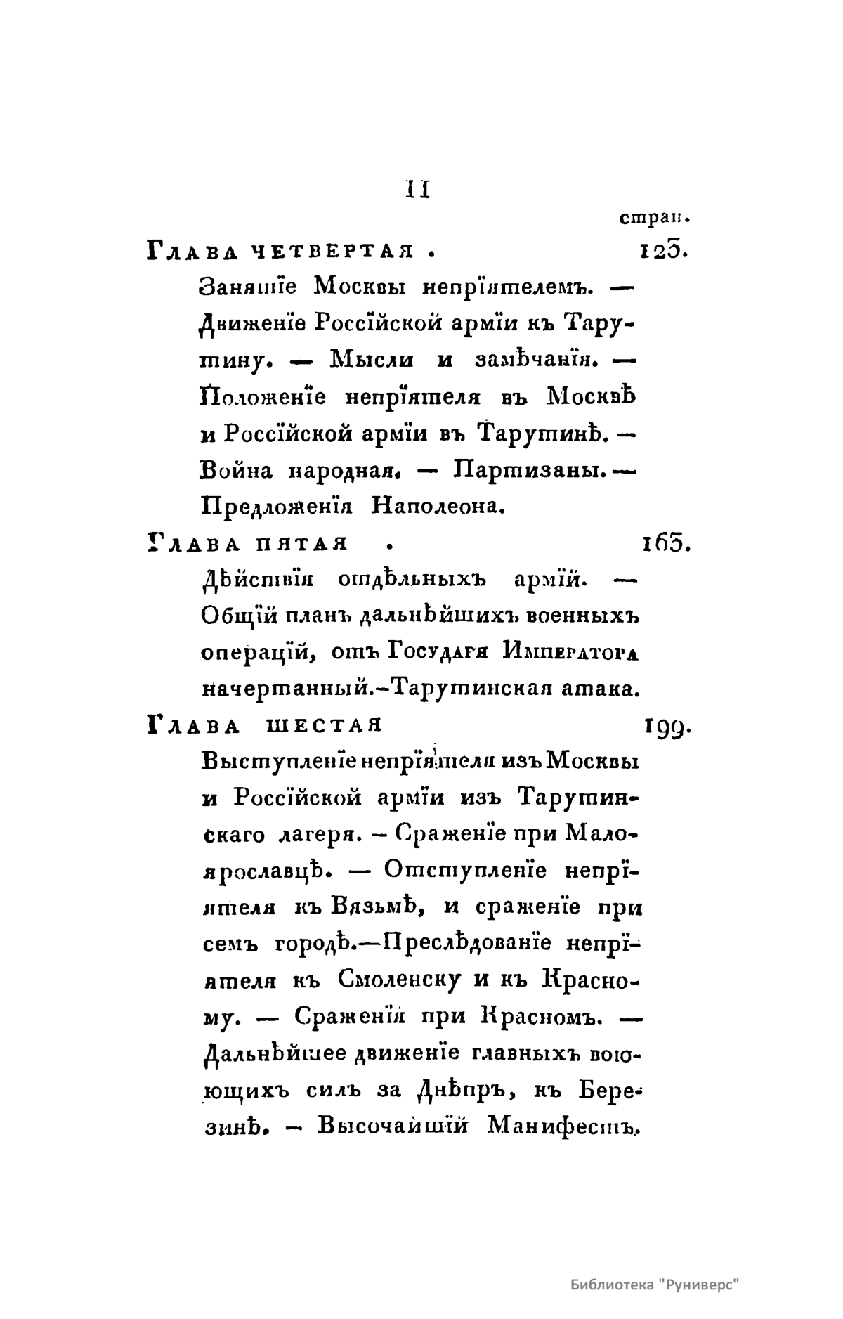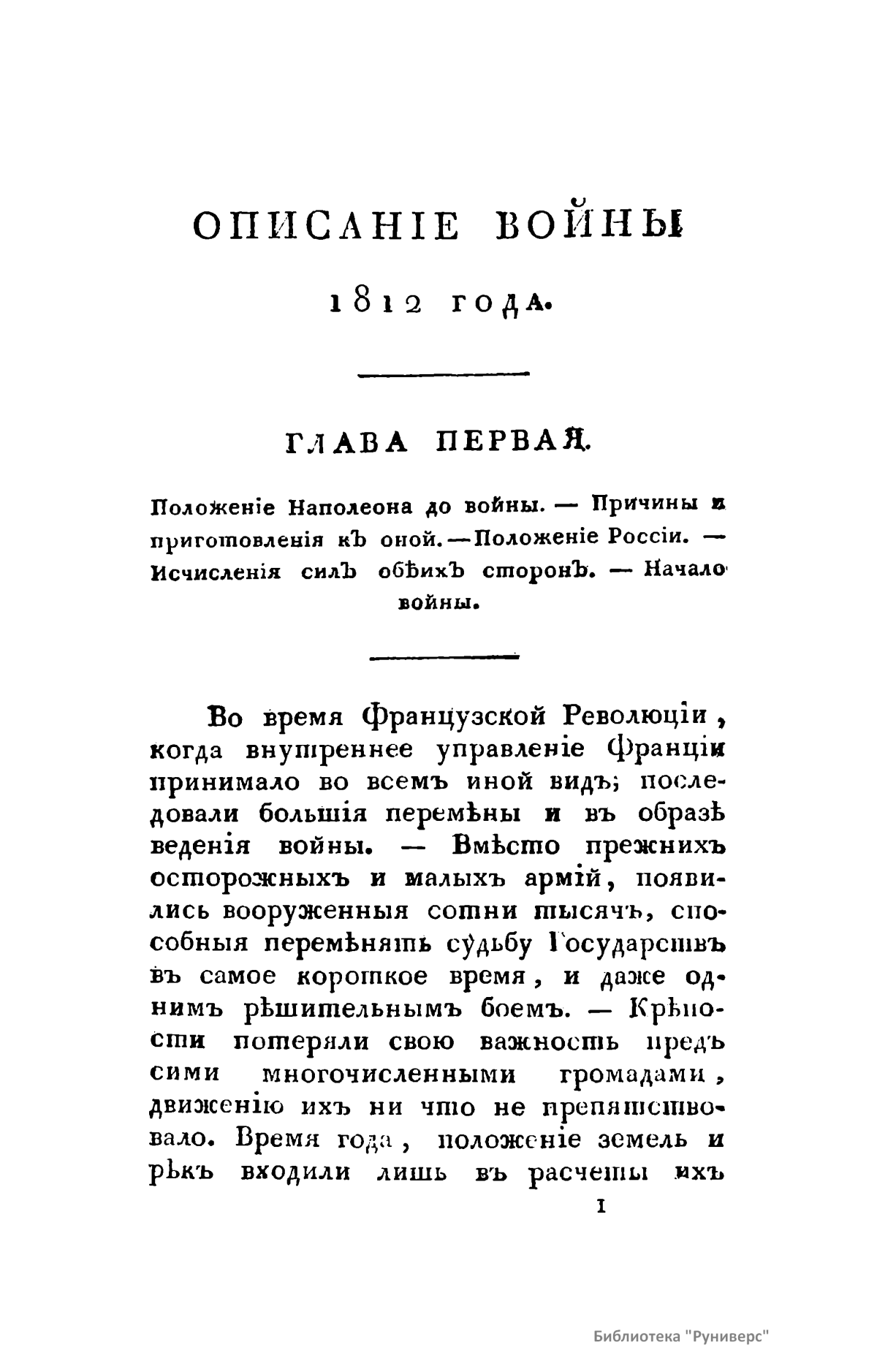 В книге описана освободительная война России против Наполеона Бонапарта. «Год сей пребудет незабвенным в позднейшем потомстве. К побиению орд Мамая, к поражению Карла под Полтавой история приобщит отныне сокрушение сил Наполеона. Россия, сражаясь с целою Европой, познала более, нежели в другое какое время, всю великость сил своих и способов и достигла в глазах целого света величайшей, никем не оспориваемой и неувядаемой славы».