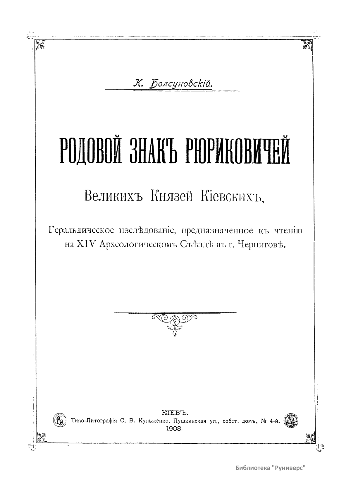 Родовой знакъ Рюриковичей Великихъ Князей Кiевскихъ. Геральдическое изслѣдованiе, предназначенное къ чтенiю на XIV Археологическомъ Съѣздѣ въ г. Черниговѣ