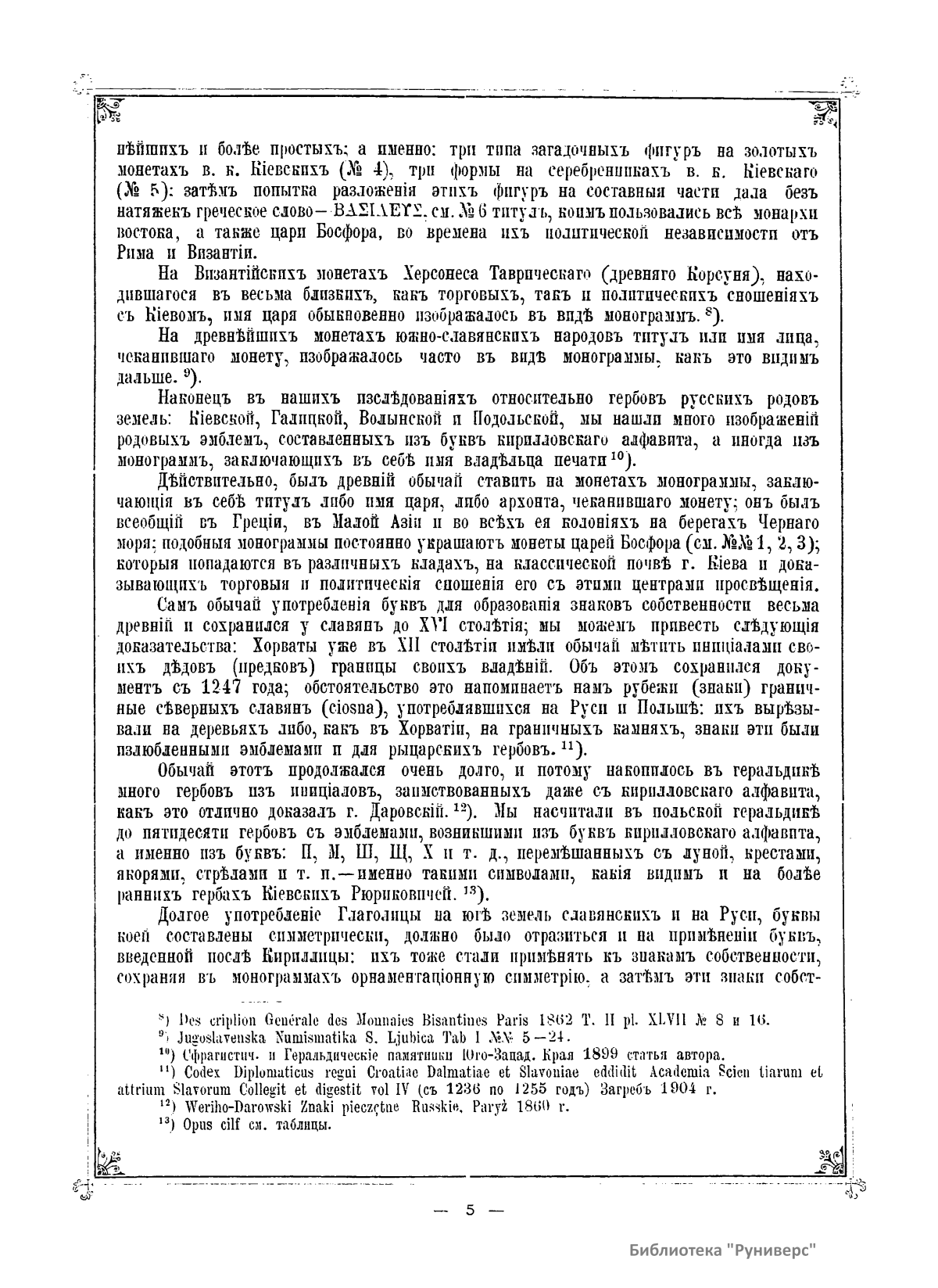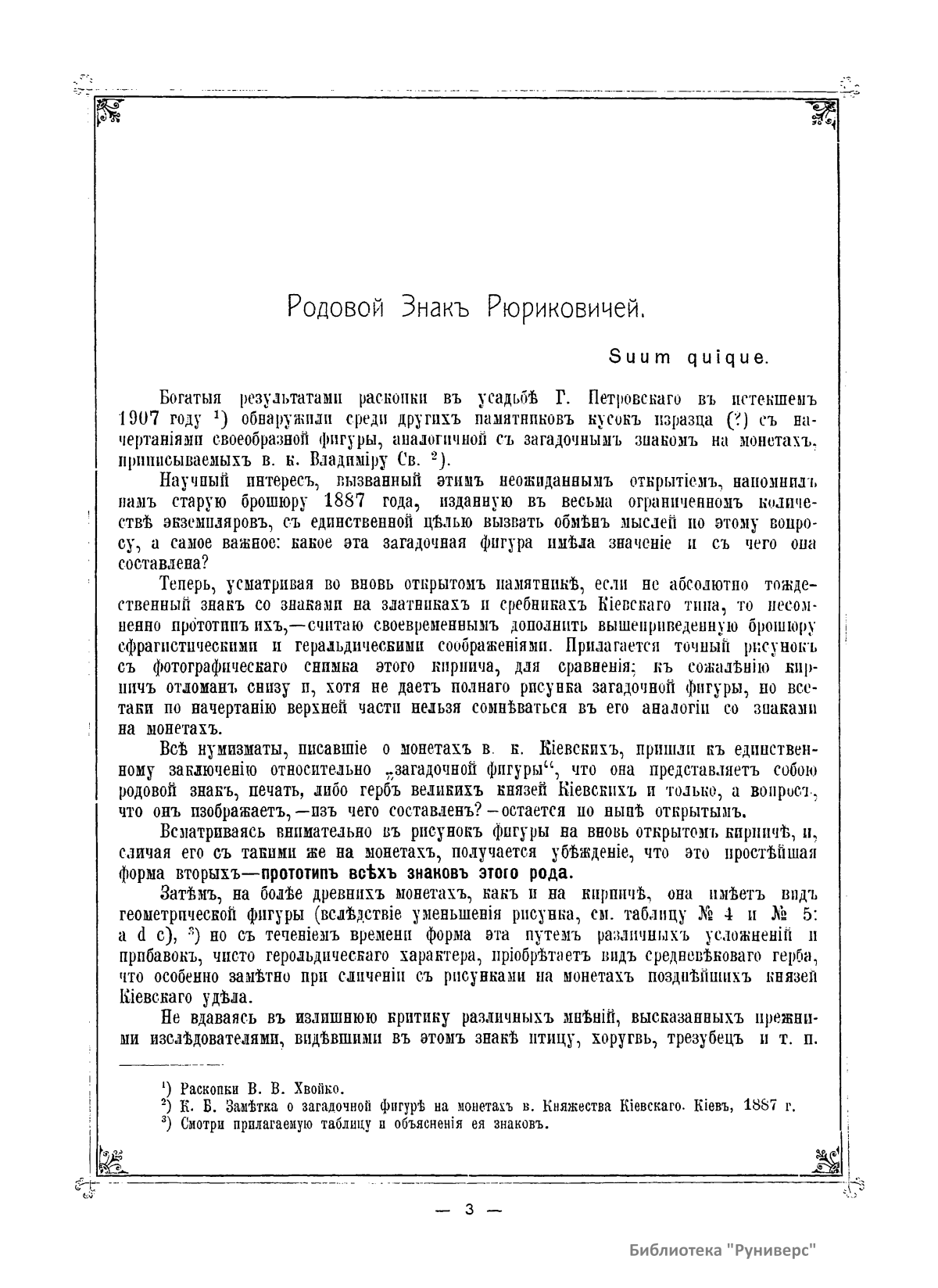 Геральдическое исследование, в котором автор отвечает на вопрос, что означает загадочный знак на монетах, приписываемых великому князю Владимиру Святому. Сделать вывод ему помогают результаты раскопок в усадьбе Г. Петровского в 1907 г., когда был обнаружен кусок изразца с начертаниями своеобразной фигуры, аналогичной изображению на монетах.
