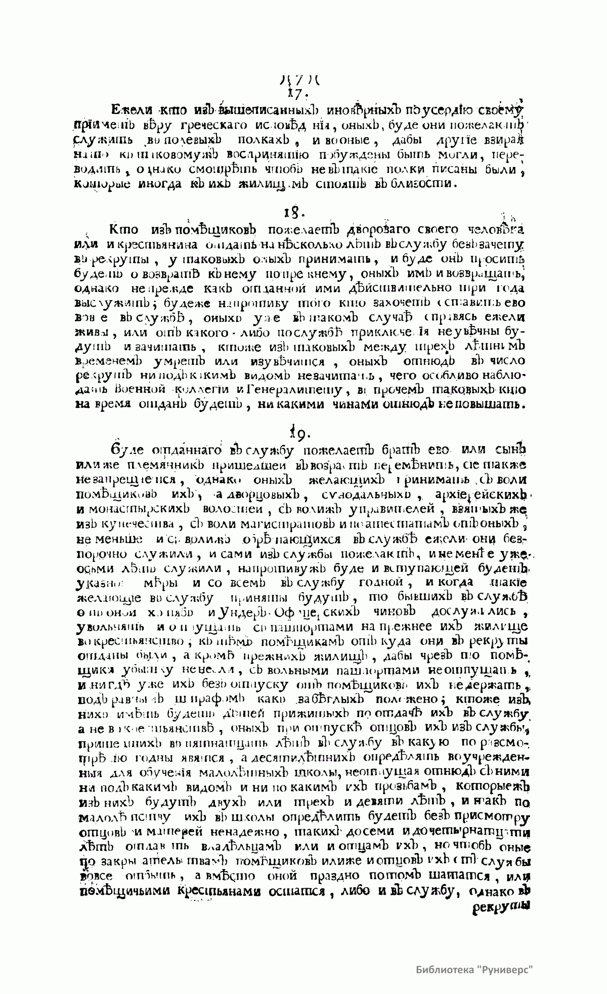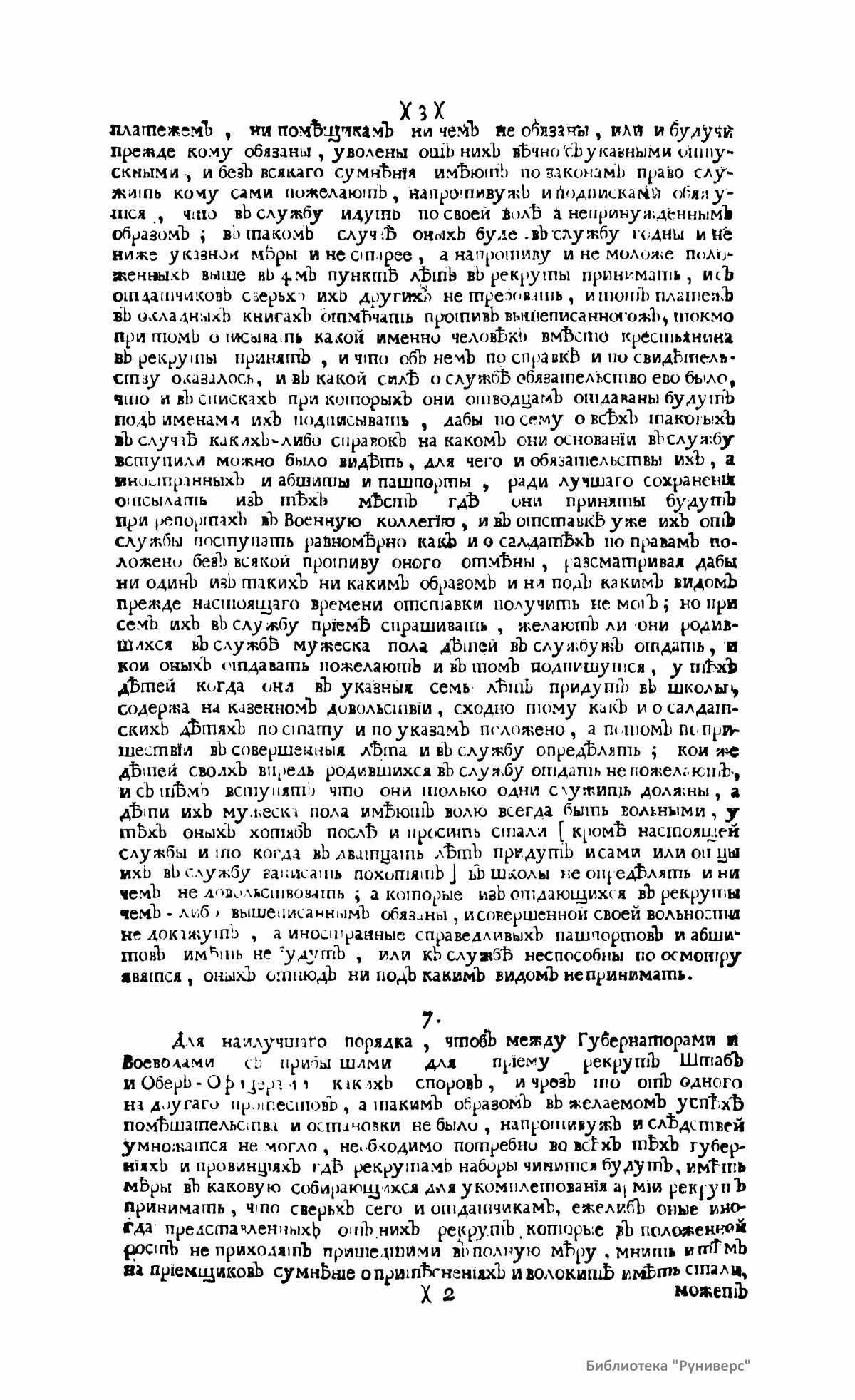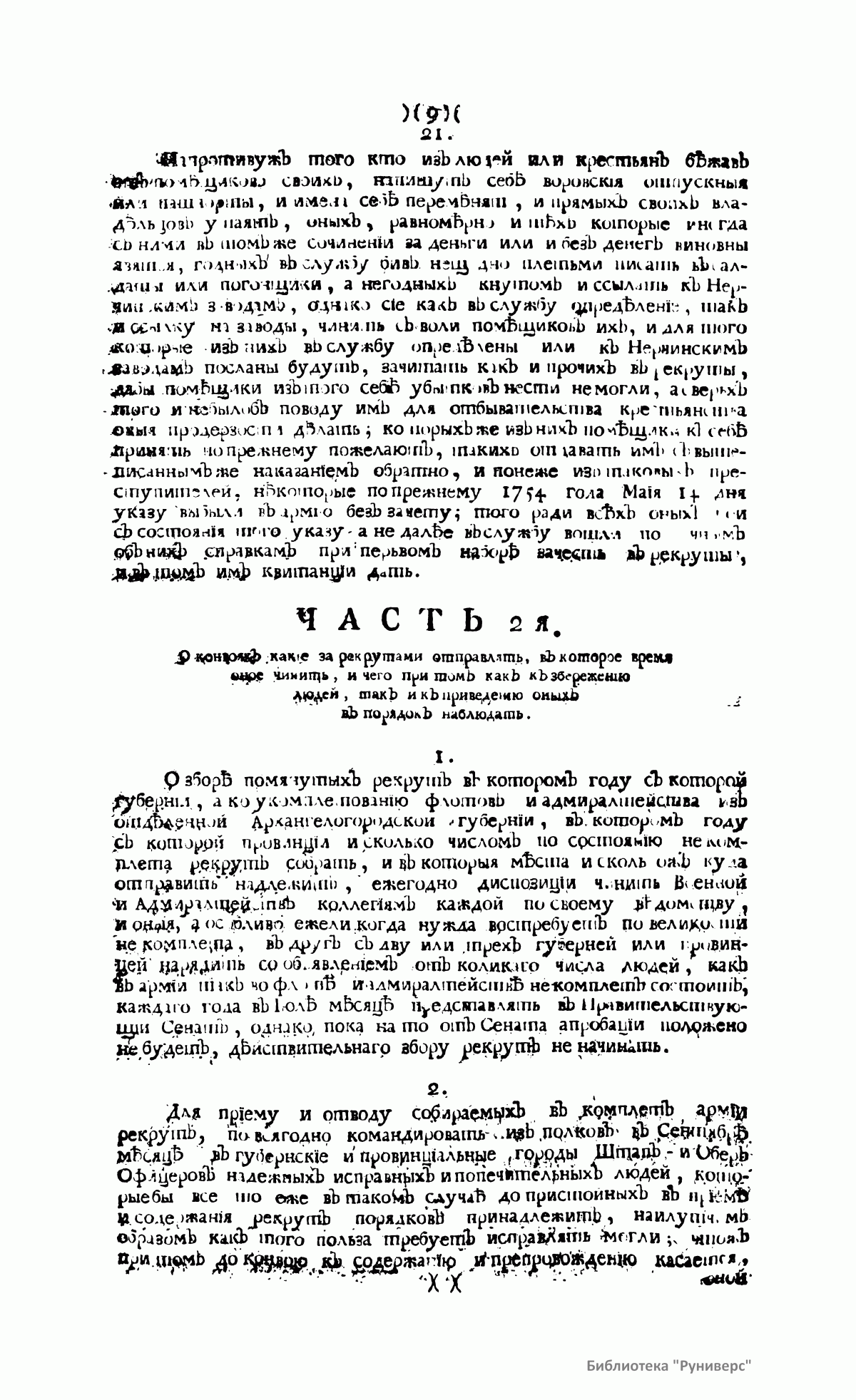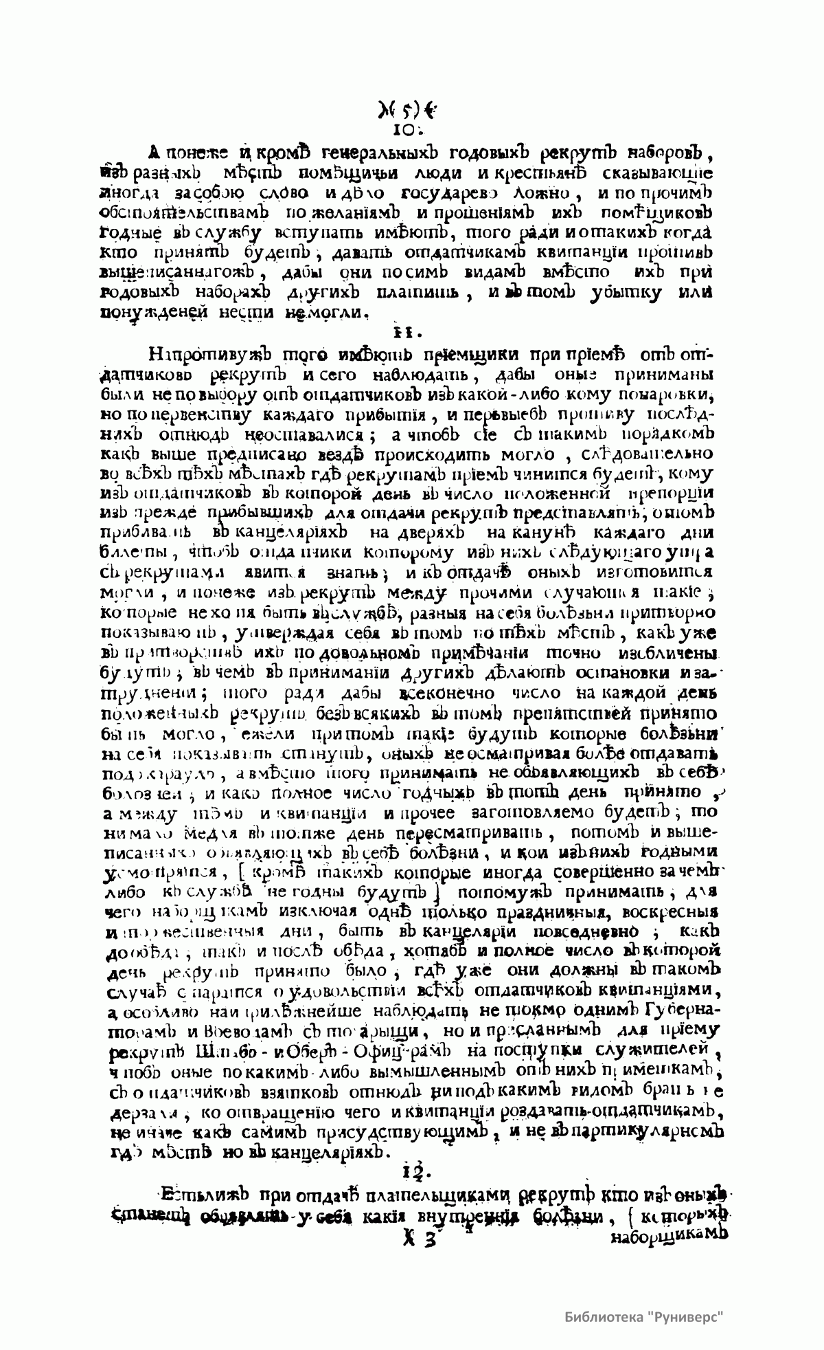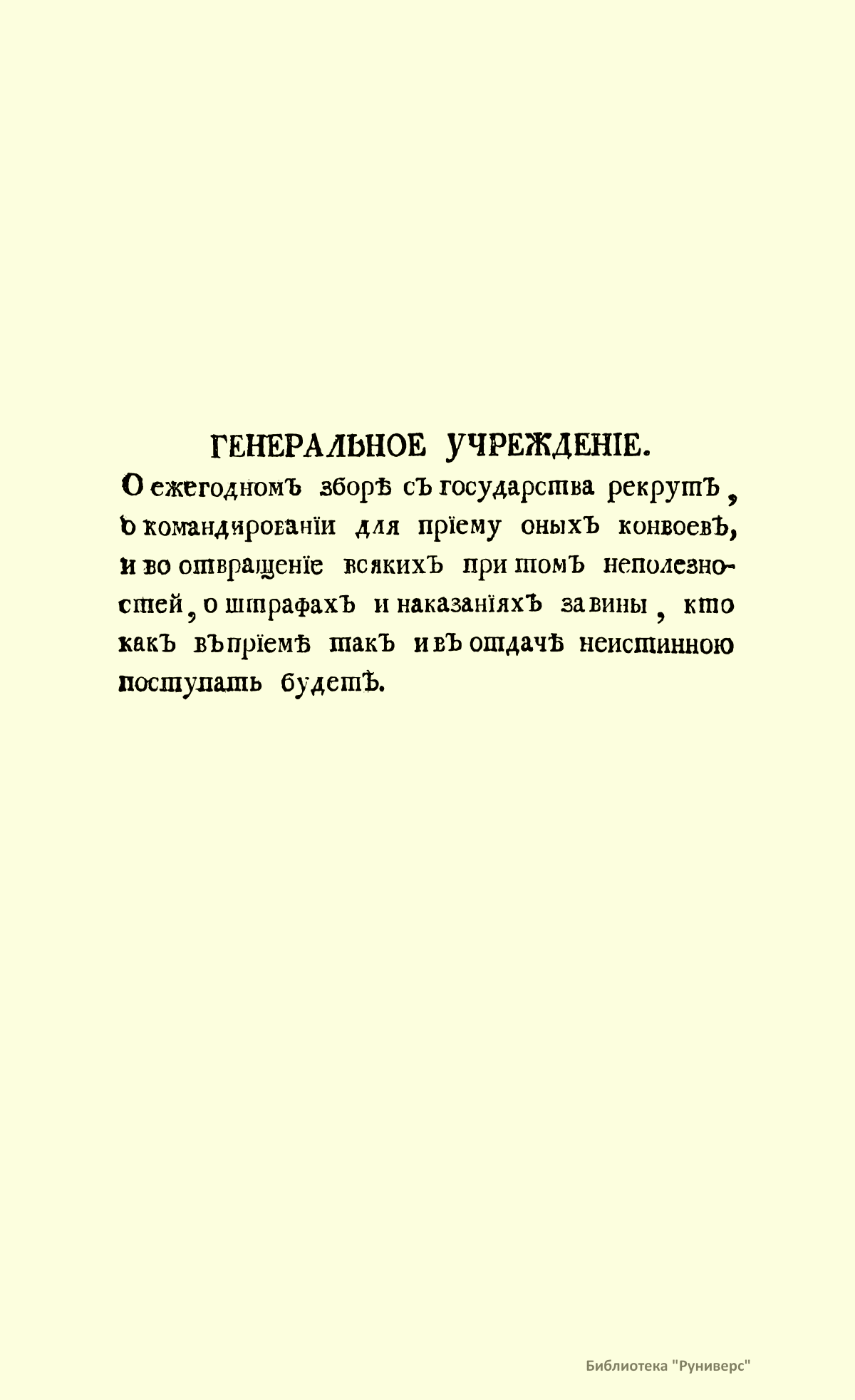 Генеральное учрежденiе. О ежегодномъ зборѣ съ государства рекрутъ, о командированiи для прiема оныхъ конвоевъ, и во отвращенiе всякихъ при томъ неполезностей, о штрафахъ и наказанiяхъ за вины, кто какъ въ приемѣ такъ и въ отдачѣ неистинною поступать будетѣ
