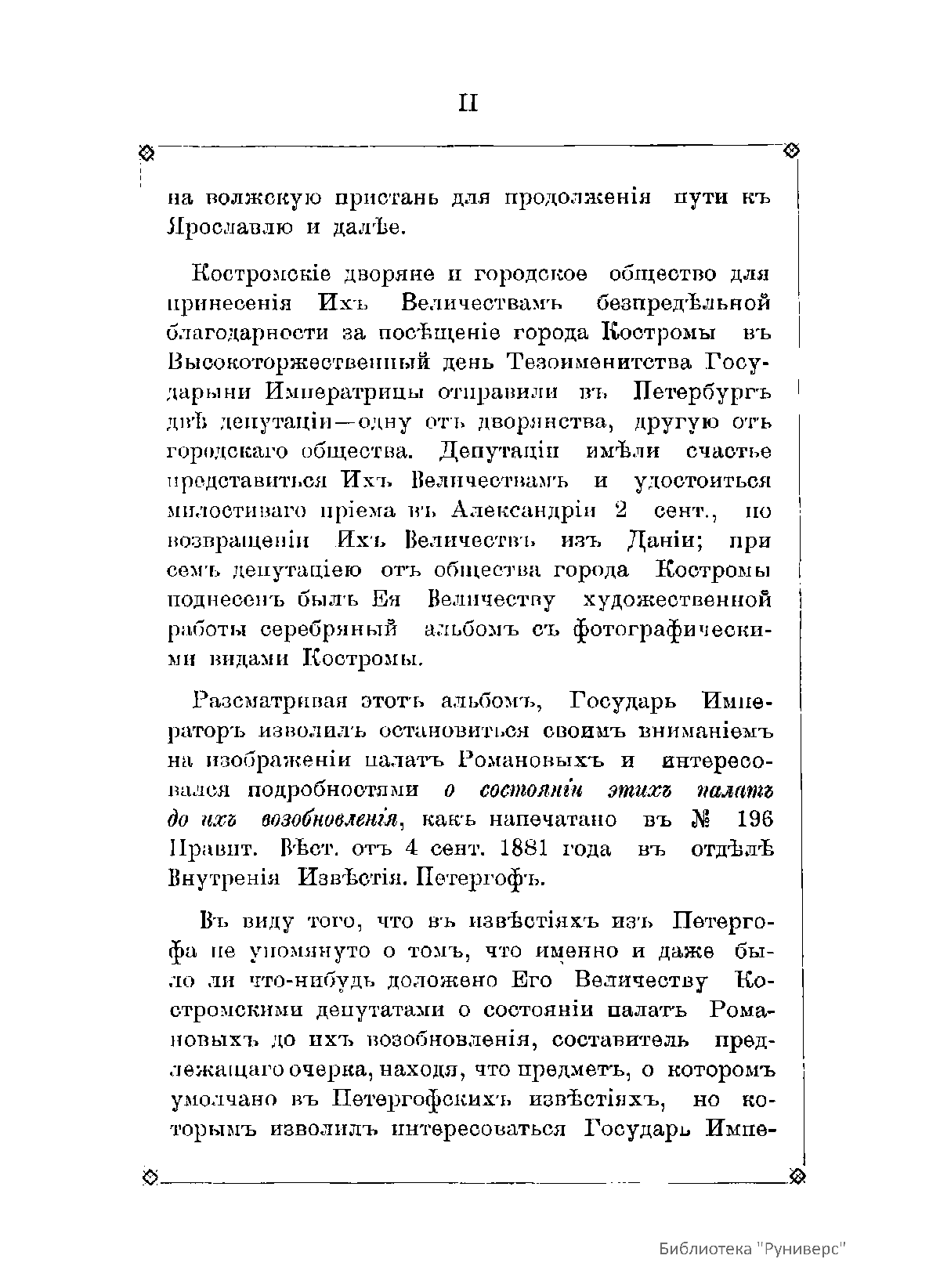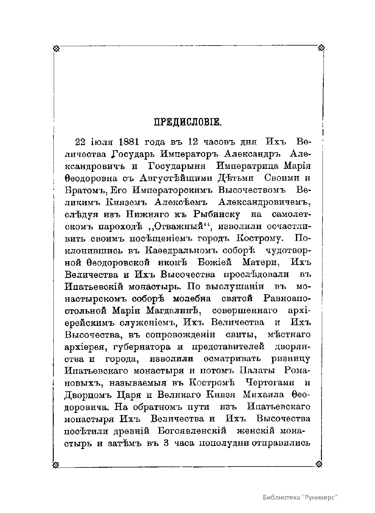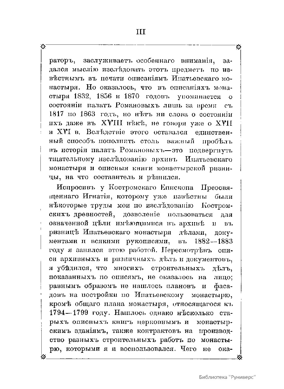 Исторический очерк по делам и документам Ипатьевского архива. В издании представлены: краткий исторический очерк костромского Ипатьевского монастыря (10); сообщение о месте, занимаемом палатами Романовых в монастыре, когда и кем они построены, кто занимал это здание до и после 1613 г. (19); сообщение о состоянии наместнических келий в XVII и XVIII вв. (28); о наместнических кельях в начале XIX в., которые принимают название царских чертогов и дворца царя и великого князя Михаила Федоровича, и о ряде мер со стороны епархиального начальства к охранению чертогов от разрушения (41); о следах особого внимания членов царствующего Дома к келиям Михаила Федоровича в Ипатьевском монастыре по делам и документам с XVII по XIX в. (67); о посещении Ипатьевского монастыря и палат Михаила Федоровича Высочайшими особами царствующего в России Дома. К изданию прилагаются: вид костромского Ипатьевского монастыря с восточной стороны (8); портрет Михаила Федоровича (26); портрет патриарха Филарета Никитича (80); портрет великой старицы инокини Марфы Иоанновны (82); изображение памятника костромскому крестьянину Ивану Сусанину, «за царя, спасителя веры и царство живот свой положившему» (66); план Ипатьевского монастыря 1794 – 1799 гг. и его экспликация (93); смета майора и архитектора Мичурина на исправление ветхостей в кельях наместнических 1742 г.; вид палат царя Михаила Федоровича в 1832 г. (100); различные планы палат; опись древностей Ипатьевского монастыря (104).