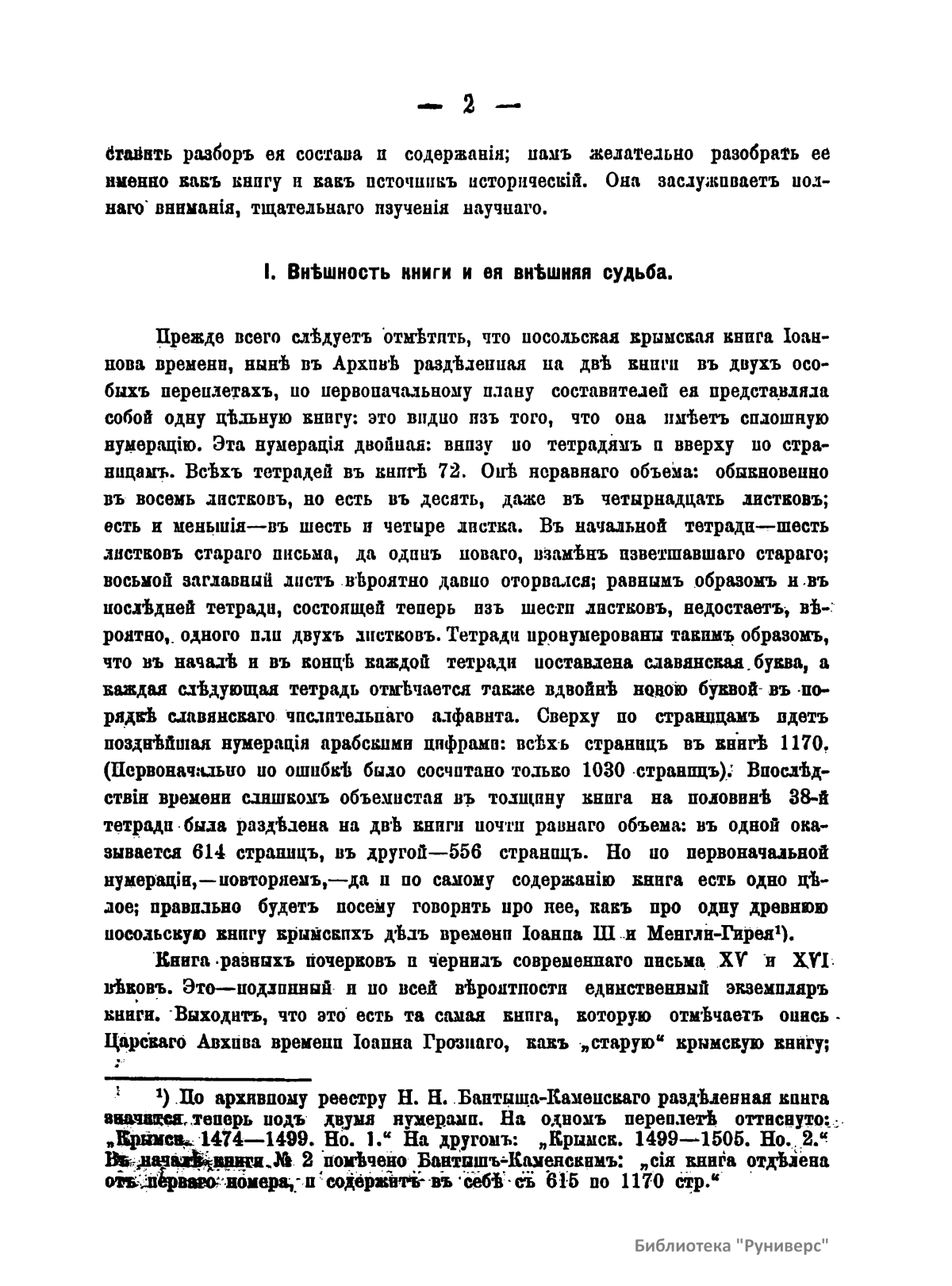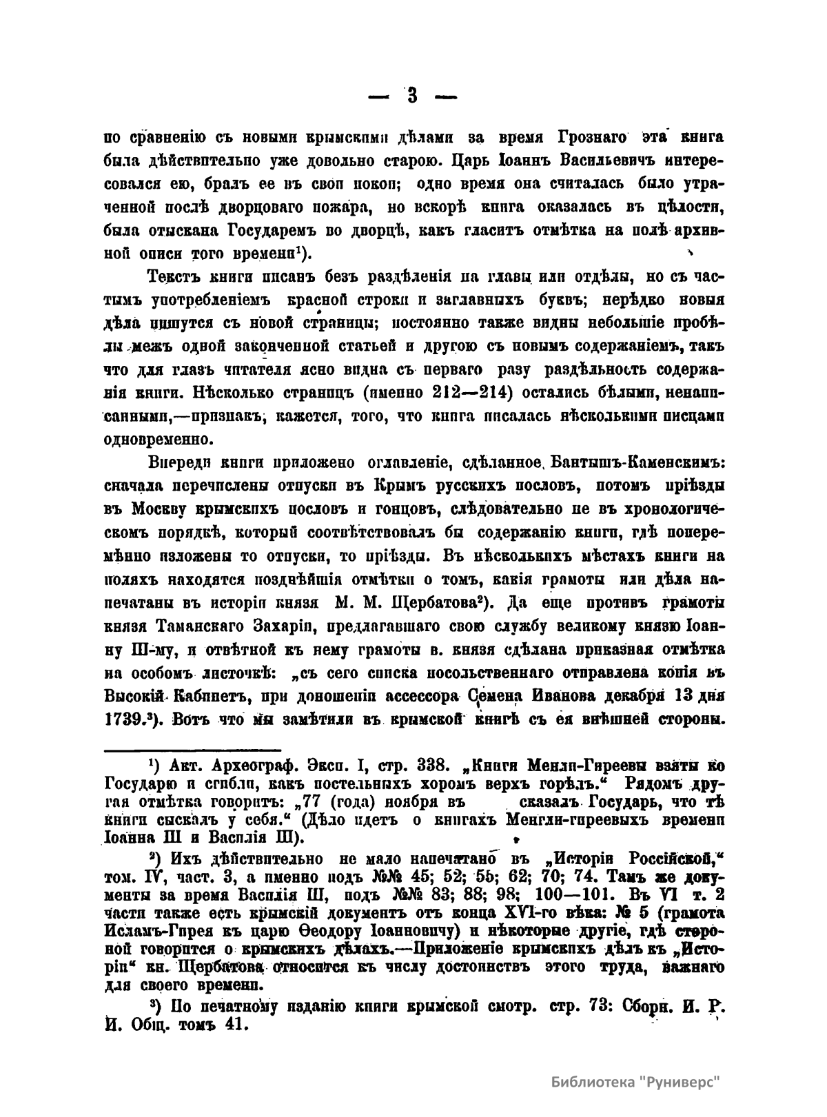 Настоящая брошюра посвящена характеристике самой древней посольской книге крымских дел, хранившейся в Главном архиве министерства иностранных дел в Москве. Эта книга представляет собой цельную летопись посольских сношений Ивана III Васильевича с его союзником – крымским царем Менгли-Гиреем. В нее внесены и дела по сношениям с турецкой Кафой и Царьградом, Казанью, Молдавией, Угрией, Польско-Литовским государством, так как дела этих земель соприкасались между собой для Московского государства и Крыма. В книге содержится много данных о внутренней жизни Московского государства и Крымской орды, а также всего татарско-турецкого мусульманского мира. Изложение книги ясное и стройное, язык образцовый по чистоте и правильности. Она «есть мастерское в своем роде произведение приказных посольских дьяков великого князя Ивана III; под их пером политическая мысль Ивана Великого получила искусное выражение, а все посольские дела – ясное отчетливое изложение». Автор рассматривает следующие вопросы: внешность книги и ее внешняя судьба (2); предварительные общие замечания о происхождении крымской посольской книги, ее составе и содержании (6); из каких именно документов составлена посольская книга (14).