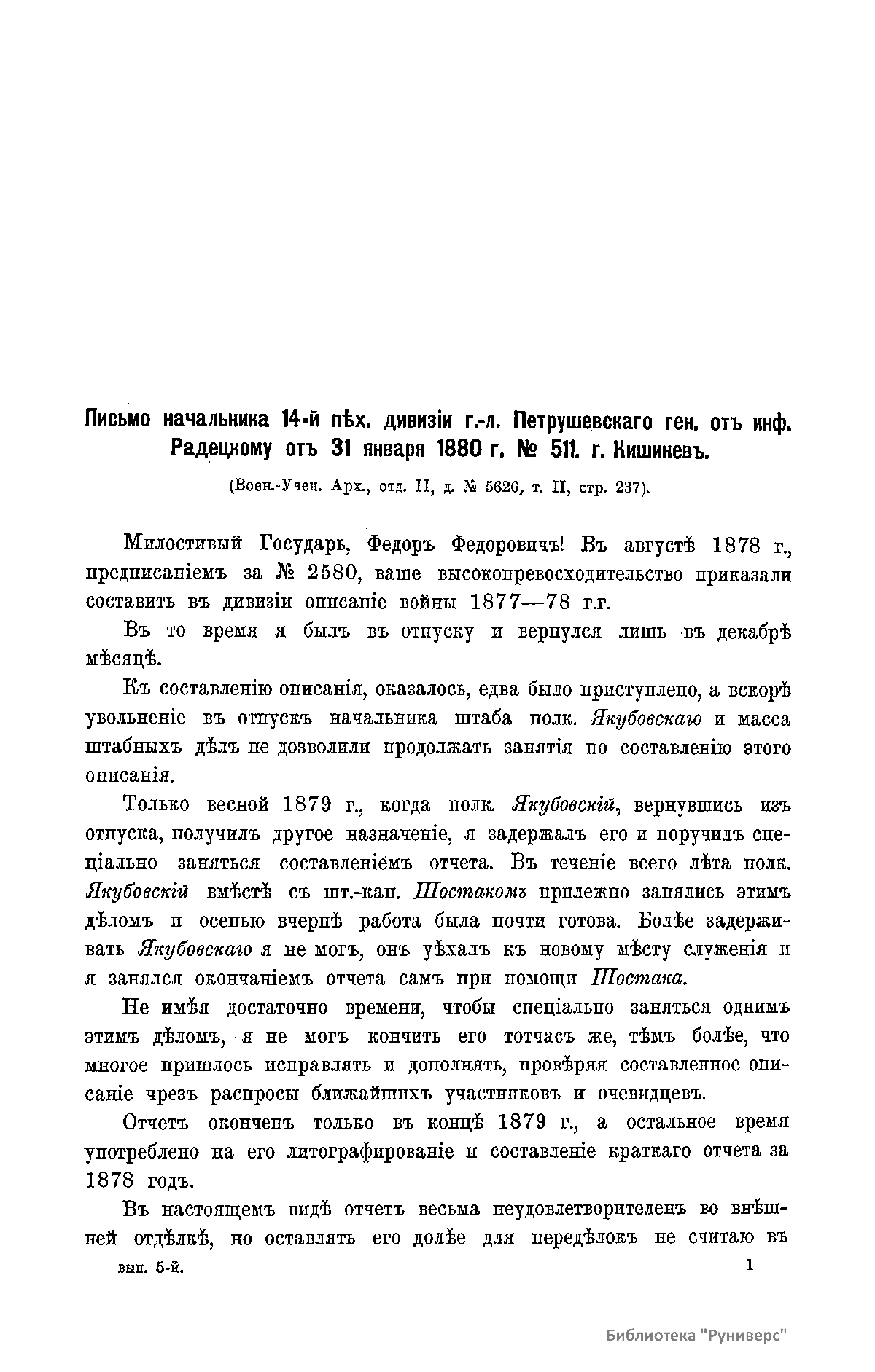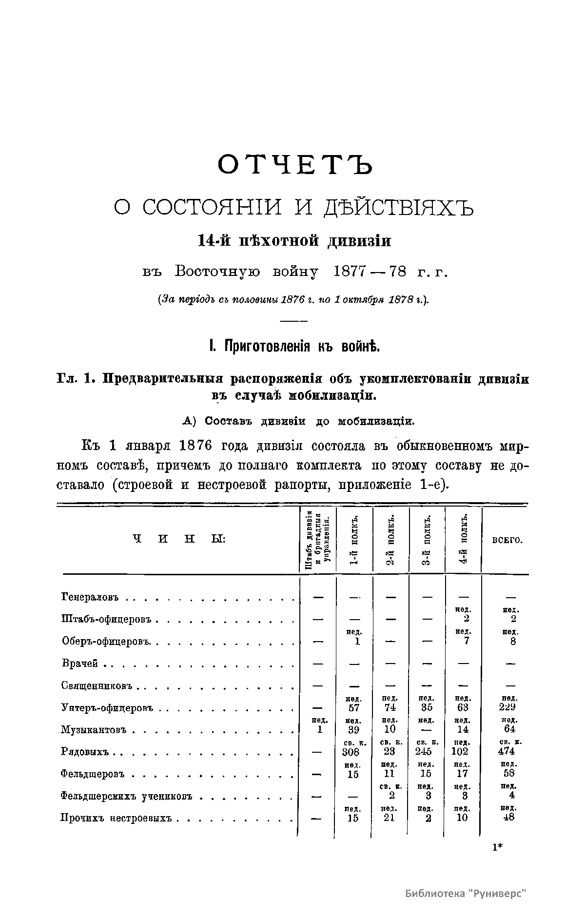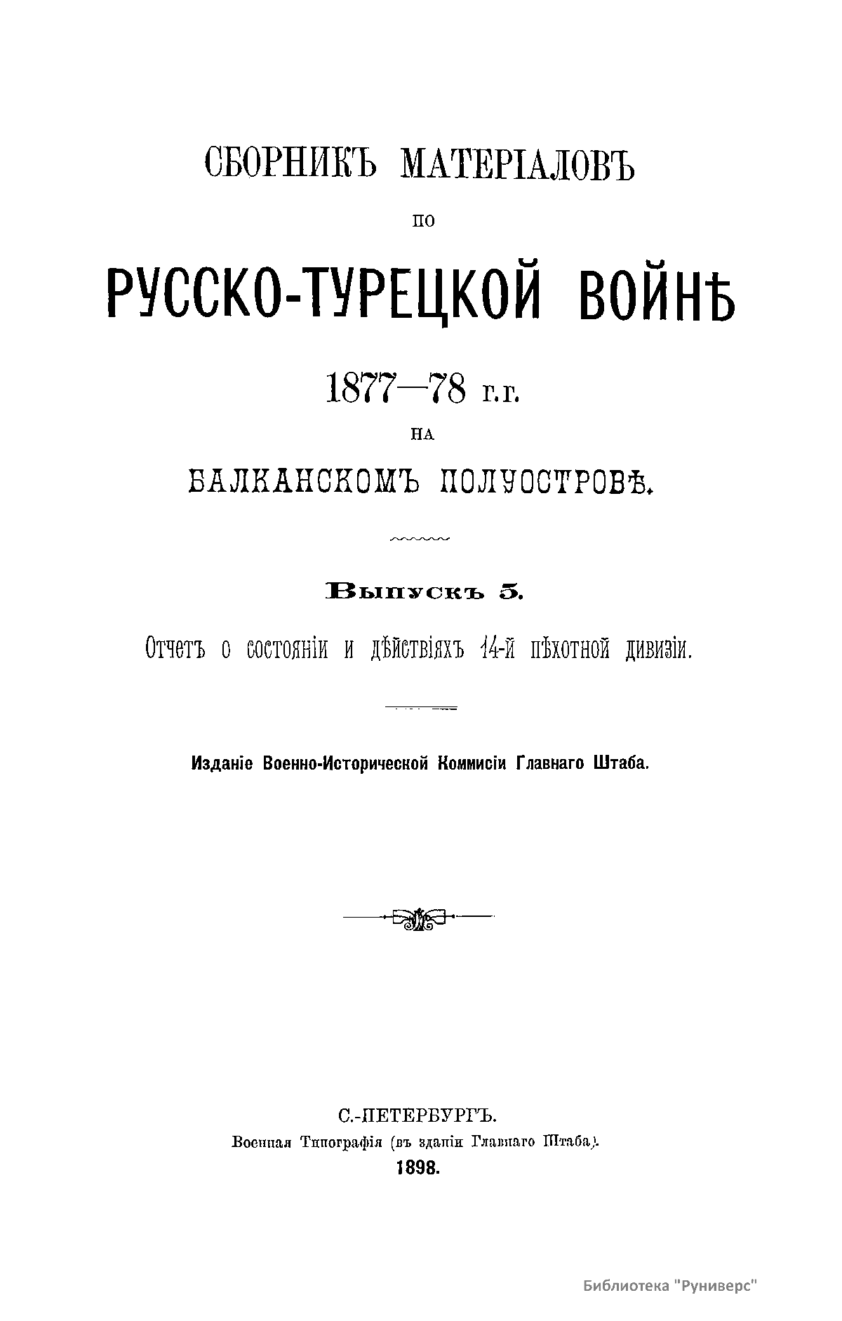 Сборникъ матерiаловъ по русско-турецкой войнѣ 1877-1878 г.г. на Балканскомъ полуостровѣ. Выпускъ 5. Отчетъ о состоянiи и дѣйствiяхъ 14-й пѣхотной дивизiи