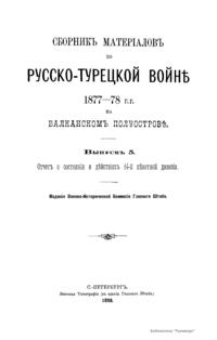 Военно-историческая комиссия Генерального штаба представляет сборник материалов по русско-турецкой войне 1877 – 1878 гг. на Балканском полуострове в 97 выпусках. Издание формирует полное представление о военных действиях и участниках этой войны. Русско-турецкая война 1877 – 1878 гг. была вызвана нежеланием Турции принять меры к улучшению положения подвластных ей христианских княжеств, обусловленному парижским трактатом 1856 г, и стремлением России укрепить свое влияние на Балканах. Способствовала освобождению народов Балканского полуострова от османского владычества. Россия объявила войну Турции 12 апреля 1877 г. Основные события: 1877 – сражение на Шипке, осада и взятие русскими войсками Плевны и Карса; 1878 – зимний переход русской армии через Балканский хребет, победы у Шипки – Шейново, Филиппополя, взятие Адрианополя. Завершилась Сан-Стефанским миром 1878 г., который обеспечил независимость балканским народам и территориальные приобретения России. Но Берлинский трактат ограничил независимость Болгарии и влияние России на Балканах.