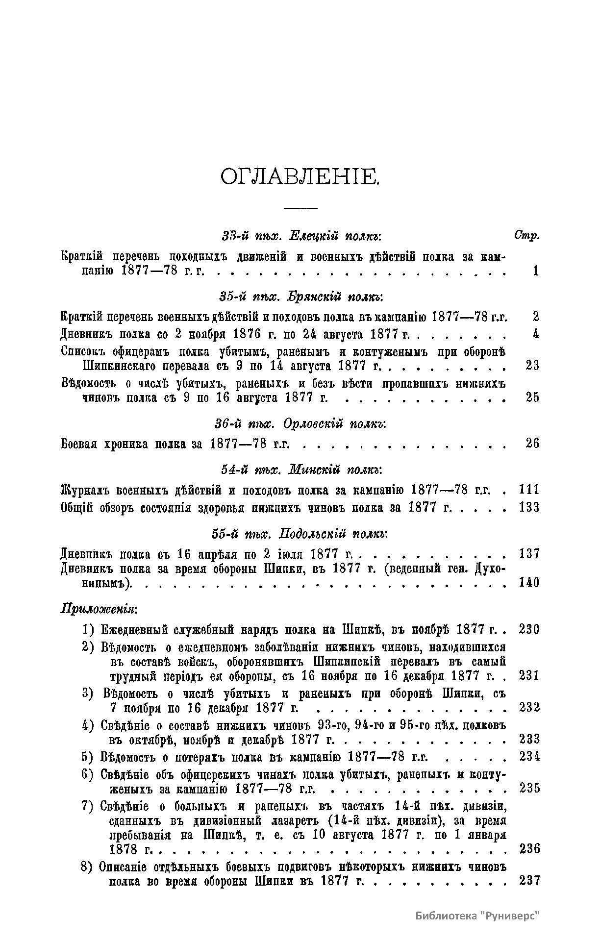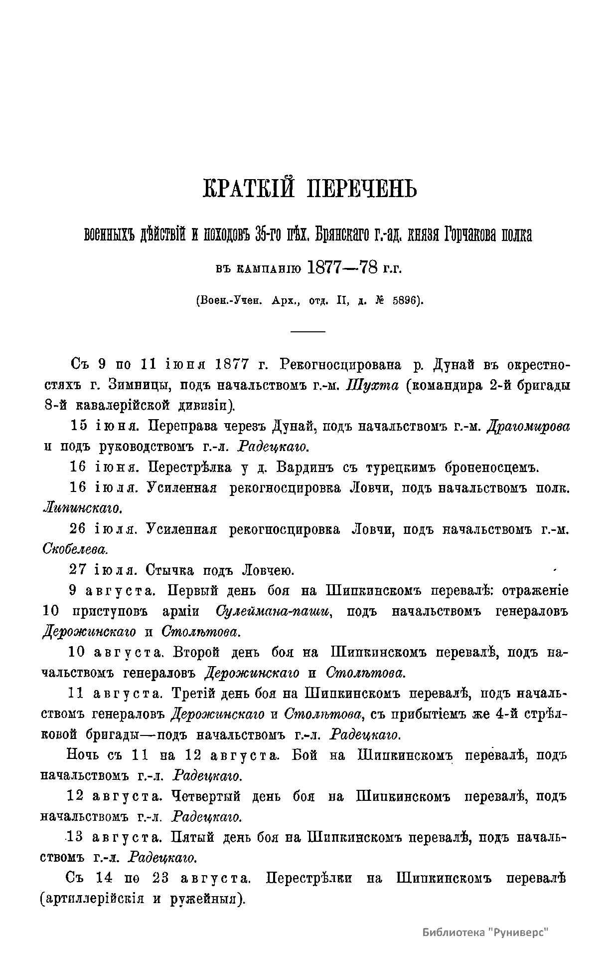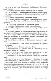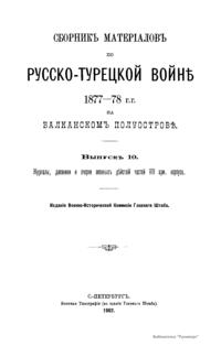 Военно-историческая комиссия Генерального штаба представляет сборник материалов по русско-турецкой войне 1877 – 1878 гг. на Балканском полуострове в 97 выпусках. Издание формирует полное представление о военных действиях и участниках этой войны. Русско-турецкая война 1877 – 1878 гг. была вызвана нежеланием Турции принять меры к улучшению положения подвластных ей христианских княжеств, обусловленному парижским трактатом 1856 г, и стремлением России укрепить свое влияние на Балканах. Способствовала освобождению народов Балканского полуострова от османского владычества. Россия объявила войну Турции 12 апреля 1877 г. Основные события: 1877 – сражение на Шипке, осада и взятие русскими войсками Плевны и Карса; 1878 – зимний переход русской армии через Балканский хребет, победы у Шипки – Шейново, Филиппополя, взятие Адрианополя. Завершилась Сан-Стефанским миром 1878 г., который обеспечил независимость балканским народам и территориальные приобретения России. Но Берлинский трактат ограничил независимость Болгарии и влияние России на Балканах.