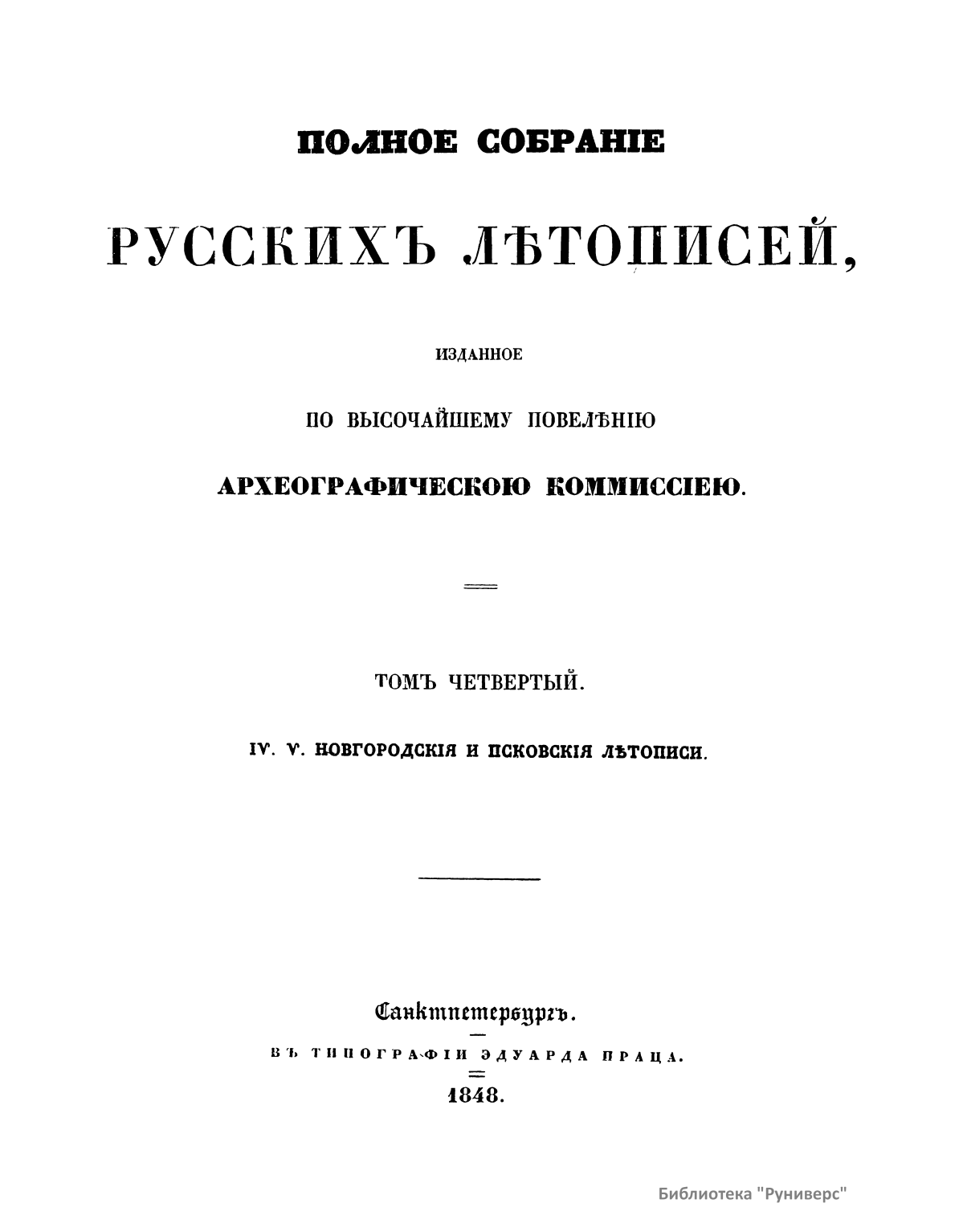 Полное собранiе русскихъ лѣтописей. Томъ четвертый. IV. V. Новгородскiя и Псковскiя лѣтописи