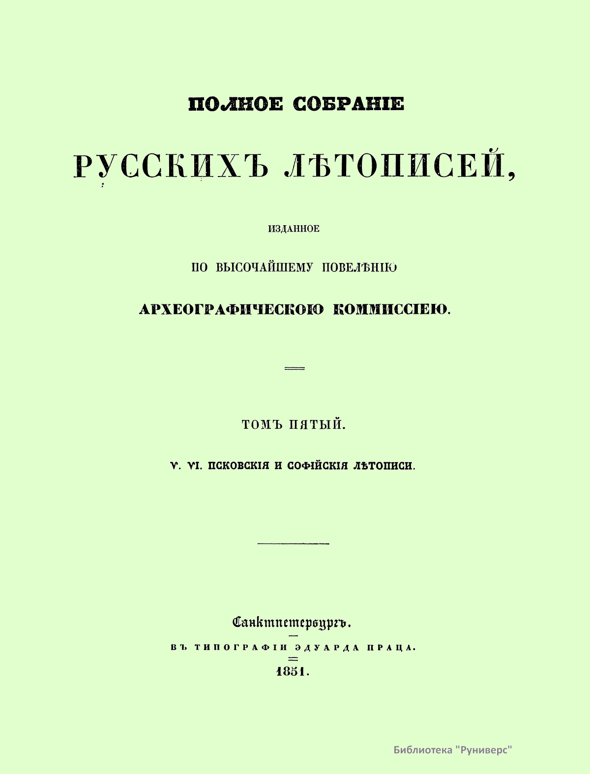 Полное собранiе русскихъ лѣтописей. Томъ пятый. V. VI. Псковкiя и Софийскiя лѣтописи