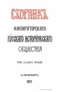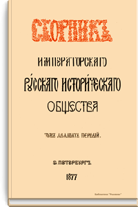 Сборники Русского исторического общества (РИО) – крупнейшая серийная публикация источников по истории России XVIII–XIX веков. За пятьдесят лет существования Общества (1866–1916) было выпущено 148 томов Сборника. Тематика опубликованных в Сборнике материалов обширна и включает в себя документы, относящиеся как к внутренней, так и внешней политике государства. Среди них можно выделить шесть крупных серий: «Материалы по истории Екатерининской комиссии для сочинения проекта нового Уложения 1767 г.», «Бумаги Екатерины II», «Материалы для истории высших государственных учреждений России в XVIII в.», «Материалы для политической и бытовой истории в 1812 г.», «Дипломатическая переписка иностранных послов и посланников при русском дворе», «Памятники дипломатических отношений древней России с державами иностранными», включающие документы XV–XVII веков, перешедшие в РИО от Второго отделения императорской канцелярии. Помимо этих серий в Сборнике публиковались личные бумаги Петра I, Петра II, Екатерины I, Александра I, Николая I, Александра II, а также документы, связанные с деятельностью видных государственных сановников. В Сборнике выходили отчёты о годичных собраниях РИО. Во время подготовки издания Русского биографического словаря в томах 60 и 62 был помещён Азбучный указатель имён русских деятелей для словаря. Основная работа по подготовке издания Сборника лежала на ответственных секретарях РИО. Первым таким секретарём стал один из наиболее деятельных организаторов Общества А. А. Половцев. В разное время в работе Общества принимали участие крупные историки: С. М. Соловьёв, В. О. Ключевский, Н. И. Костомаров, Н. Ф. Дубровин, П. П. Пекарский, В. И. Сергеевич, Я. К. Грот, А. Н. Филиппов, И. Е. Забелин, А. Н. Пыпин, С. Ф. Платонов, В. С. Иконников, Н. Д. Чечулин, А. Н. Попов.