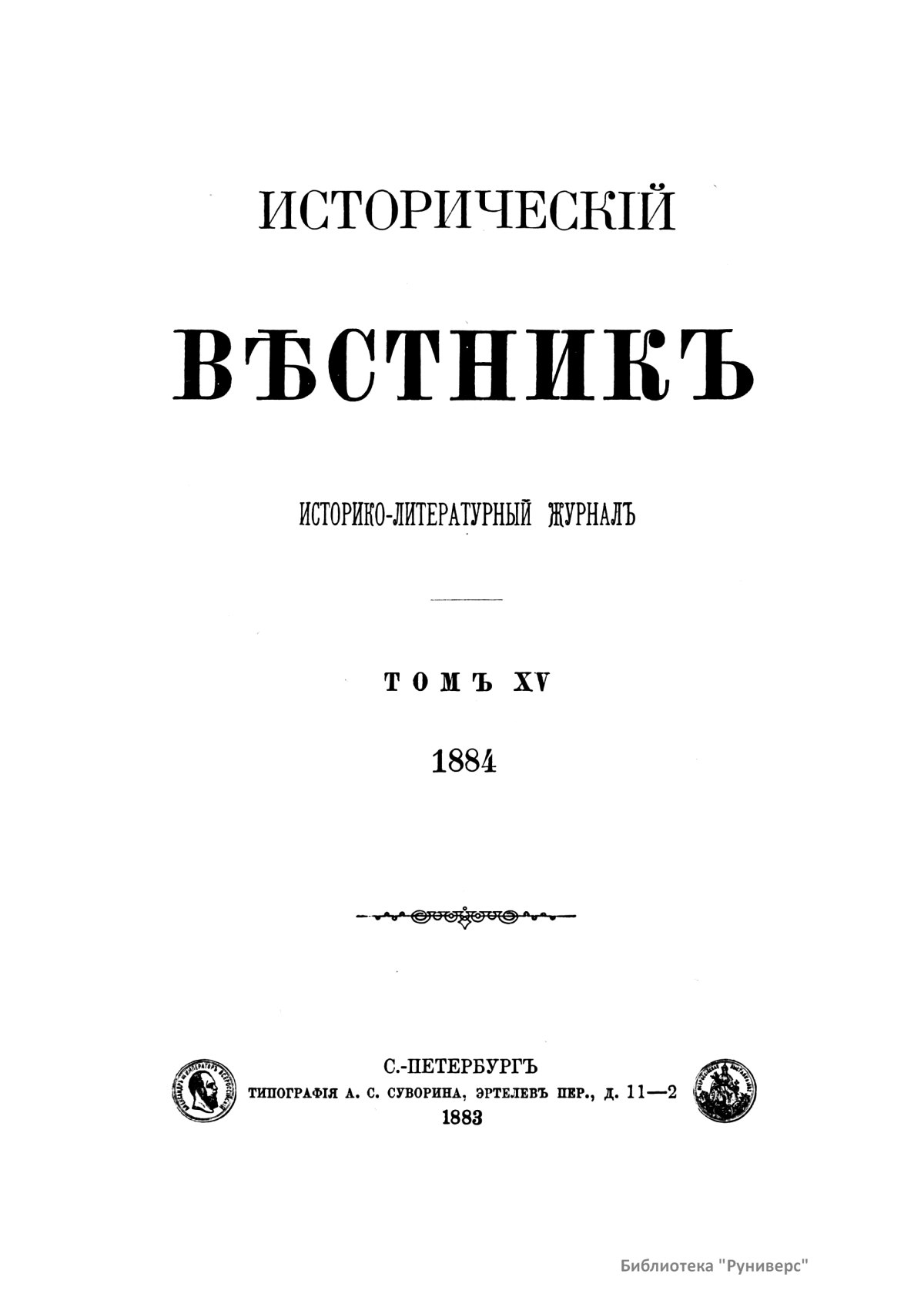 Историческiй вѣстникъ. Историко-литературный журналъ. Томъ XV