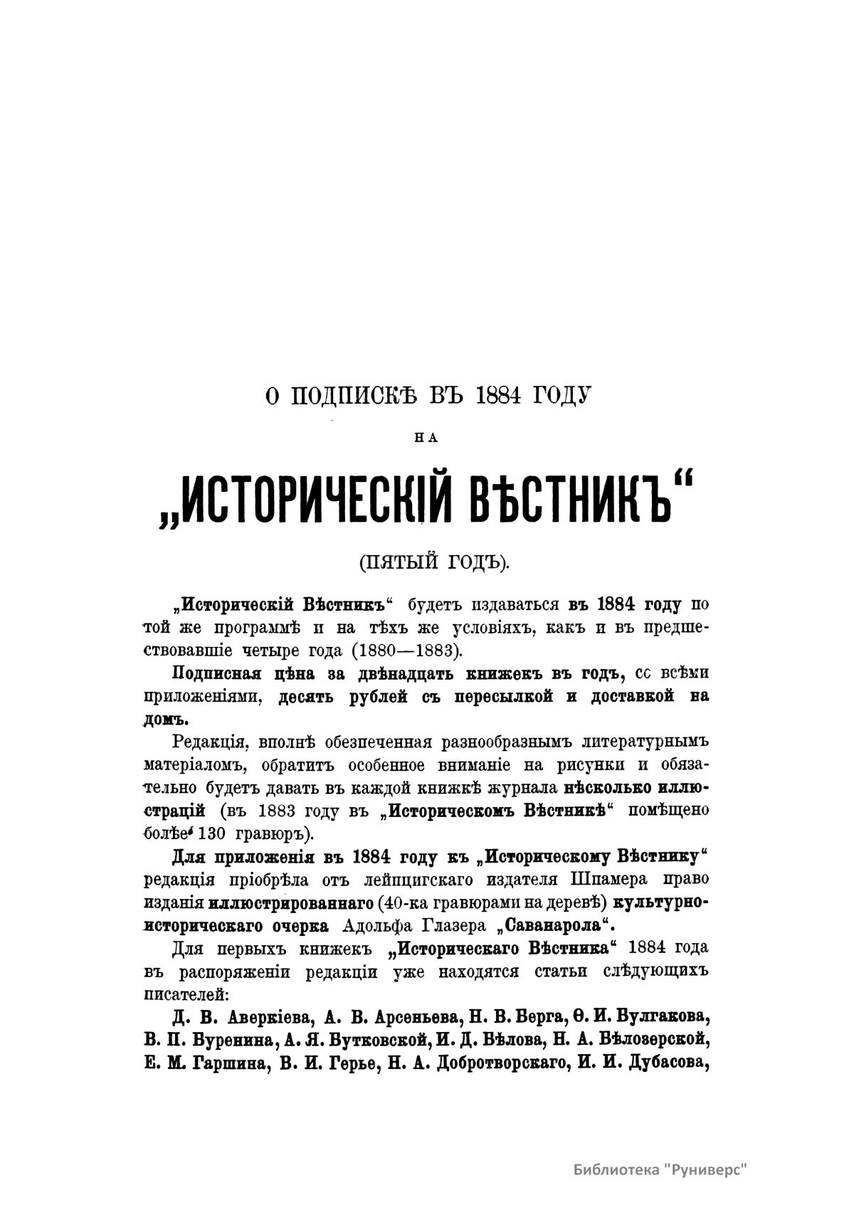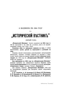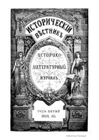 «Исторический вестник» - русский ежемесячный историко-литературный журнал. Издавался в Санкт-Петербурге с 1880-го по 1917 г. Журнал был основан А.С. Сувориным и С.Н. Шубинским с целью «знакомить читателей в живой, общедоступной форме с современным состоянием исторической науки и литературы в России и Европе». Вышло 150 тт. Каждый том состоял из трёх ежемесячных выпусков, имел свою нумерацию страниц, оглавление, список иллюстраций. Журнал приобрёл устойчивую популярность среди читателей, заняв прочное место в «триумвирате» русских исторических журналов наряду с «Русским архивом» и «Русской стариной». опережая их по количеству подписчиков. Отличием «Исторического вестника» было то, что он не помещал на своих страницах необработанных, сырых материалов. С другой стороны, журнал приближался по своему типу к журналам общелитературного образца, сочетая в себе коммерческий успех и доступное изложение материала.