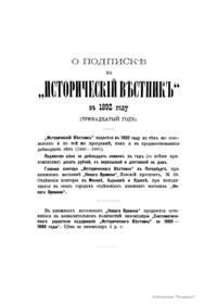 «Исторический вестник» - русский ежемесячный историко-литературный журнал. Издавался в Санкт-Петербурге с 1880-го по 1917 г. Журнал был основан А.С. Сувориным и С.Н. Шубинским с целью «знакомить читателей в живой, общедоступной форме с современным состоянием исторической науки и литературы в России и Европе». Вышло 150 тт. Каждый том состоял из трёх ежемесячных выпусков, имел свою нумерацию страниц, оглавление, список иллюстраций. Журнал приобрёл устойчивую популярность среди читателей, заняв прочное место в «триумвирате» русских исторических журналов наряду с «Русским архивом» и «Русской стариной». опережая их по количеству подписчиков. Отличием «Исторического вестника» было то, что он не помещал на своих страницах необработанных, сырых материалов. С другой стороны, журнал приближался по своему типу к журналам общелитературного образца, сочетая в себе коммерческий успех и доступное изложение материала.