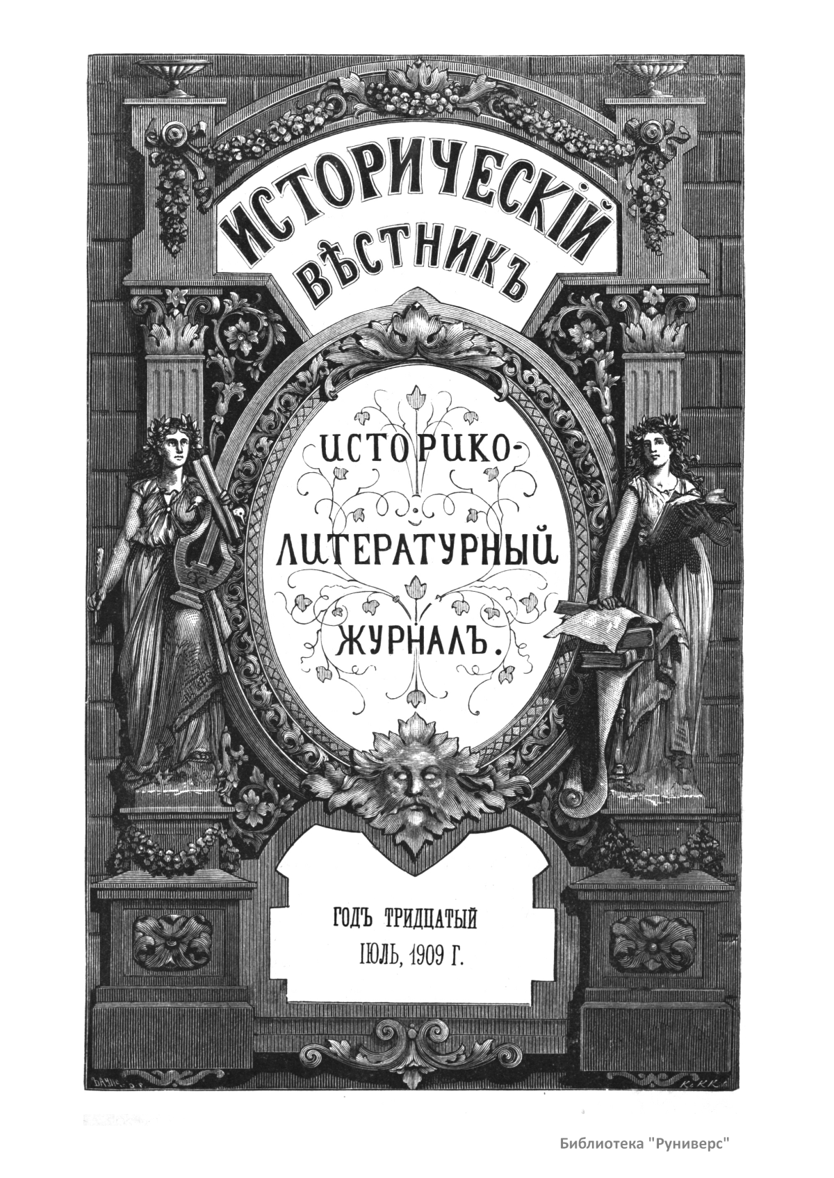 «Исторический вестник» - русский ежемесячный историко-литературный журнал. Издавался в Санкт-Петербурге с 1880-го по 1917 г. Журнал был основан А.С. Сувориным и С.Н. Шубинским с целью «знакомить читателей в живой, общедоступной форме с современным состоянием исторической науки и литературы в России и Европе». Вышло 150 тт. Каждый том состоял из трёх ежемесячных выпусков, имел свою нумерацию страниц, оглавление, список иллюстраций. Журнал приобрёл устойчивую популярность среди читателей, заняв прочное место в «триумвирате» русских исторических журналов наряду с «Русским архивом» и «Русской стариной». опережая их по количеству подписчиков. Отличием «Исторического вестника» было то, что он не помещал на своих страницах необработанных, сырых материалов. С другой стороны, журнал приближался по своему типу к журналам общелитературного образца, сочетая в себе коммерческий успех и доступное изложение материала.