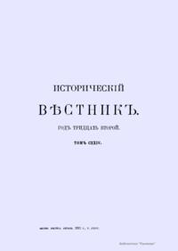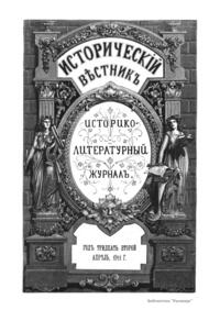 «Исторический вестник» - русский ежемесячный историко-литературный журнал. Издавался в Санкт-Петербурге с 1880-го по 1917 г. Журнал был основан А.С. Сувориным и С.Н. Шубинским с целью «знакомить читателей в живой, общедоступной форме с современным состоянием исторической науки и литературы в России и Европе». Вышло 150 тт. Каждый том состоял из трёх ежемесячных выпусков, имел свою нумерацию страниц, оглавление, список иллюстраций. Журнал приобрёл устойчивую популярность среди читателей, заняв прочное место в «триумвирате» русских исторических журналов наряду с «Русским архивом» и «Русской стариной». опережая их по количеству подписчиков. Отличием «Исторического вестника» было то, что он не помещал на своих страницах необработанных, сырых материалов. С другой стороны, журнал приближался по своему типу к журналам общелитературного образца, сочетая в себе коммерческий успех и доступное изложение материала.