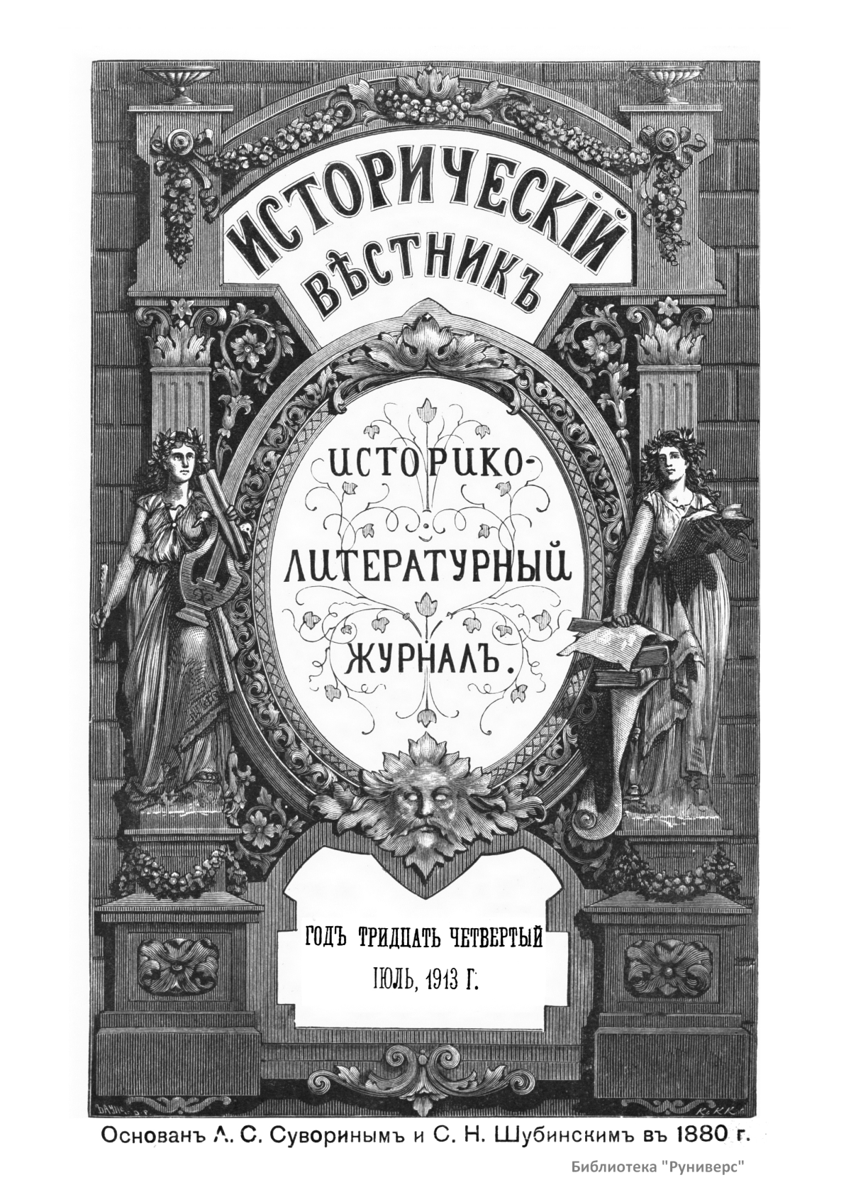 «Исторический вестник» - русский ежемесячный историко-литературный журнал. Издавался в Санкт-Петербурге с 1880-го по 1917 г. Журнал был основан А.С. Сувориным и С.Н. Шубинским с целью «знакомить читателей в живой, общедоступной форме с современным состоянием исторической науки и литературы в России и Европе». Вышло 150 тт. Каждый том состоял из трёх ежемесячных выпусков, имел свою нумерацию страниц, оглавление, список иллюстраций. Журнал приобрёл устойчивую популярность среди читателей, заняв прочное место в «триумвирате» русских исторических журналов наряду с «Русским архивом» и «Русской стариной». опережая их по количеству подписчиков. Отличием «Исторического вестника» было то, что он не помещал на своих страницах необработанных, сырых материалов. С другой стороны, журнал приближался по своему типу к журналам общелитературного образца, сочетая в себе коммерческий успех и доступное изложение материала.