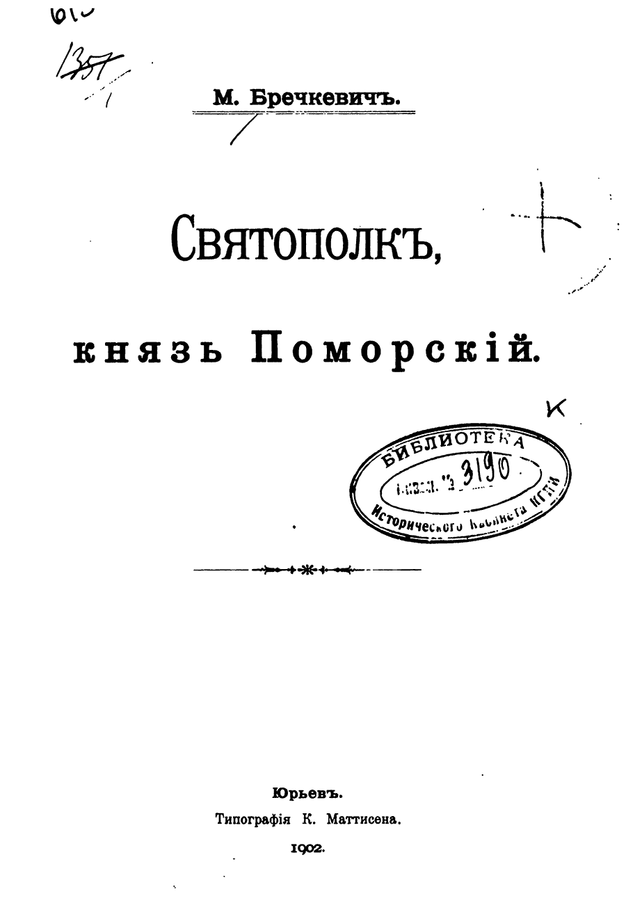 Статья «Святополк, князь Поморский» - первый печатный труд М.В. Бречкевича, выдающегося исследователя истории и культуры западных славян – посвящен историческим событиям Поморья (Pomerania Maritima) XIII века и описывает противостояние славянских князей и Тевтонского ордена. Статья была написана молодым ученым в самом начале его научного пути, в период подготовки к магистерским экзаменам, и опубликована в «Сборнике Учено-литературного общества Императорского Юрьевского университета» за 1902 г.