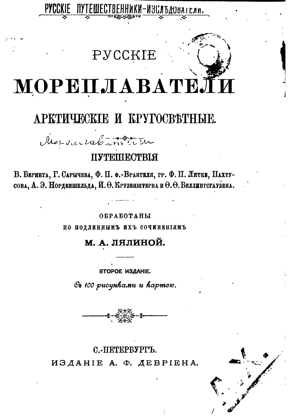 Русские мореплаватели арктические и кругосветные. Путешествия В. Беринга, Г. Сарычева, Ф.П. ф.-Врангеля, гр. Ф.П. Литке, Пахтусова, А.Э. Норденшельда, И.Ф. Крузенштерна и Ф.Ф. Беллинсгаузена