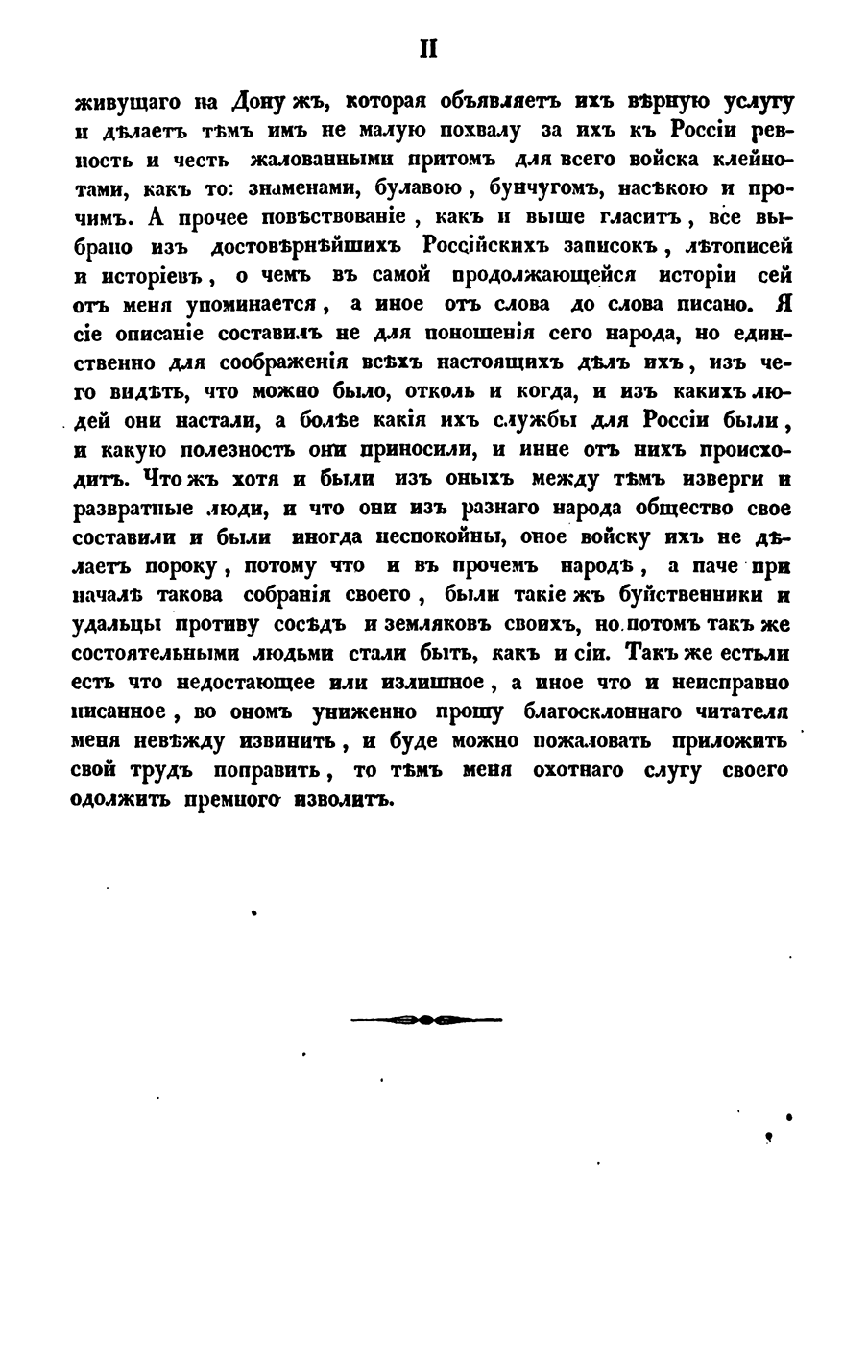 «Я сие описание составил не для поношения сего народа, но единственно для соображения всех настоящих дел их...Хотя и были из оных между тем изверги и развратные люди, и что они из разного народа общество свое составили и были иногда неспокойны, оное войску их не делает пороку, потому что и в прочем народе, а паче при начале такого собрания своего были такие ж буйственники и удальцы противу соседей и земляков своих, но потом так же состоятельными людьми стали быть, как и сии»