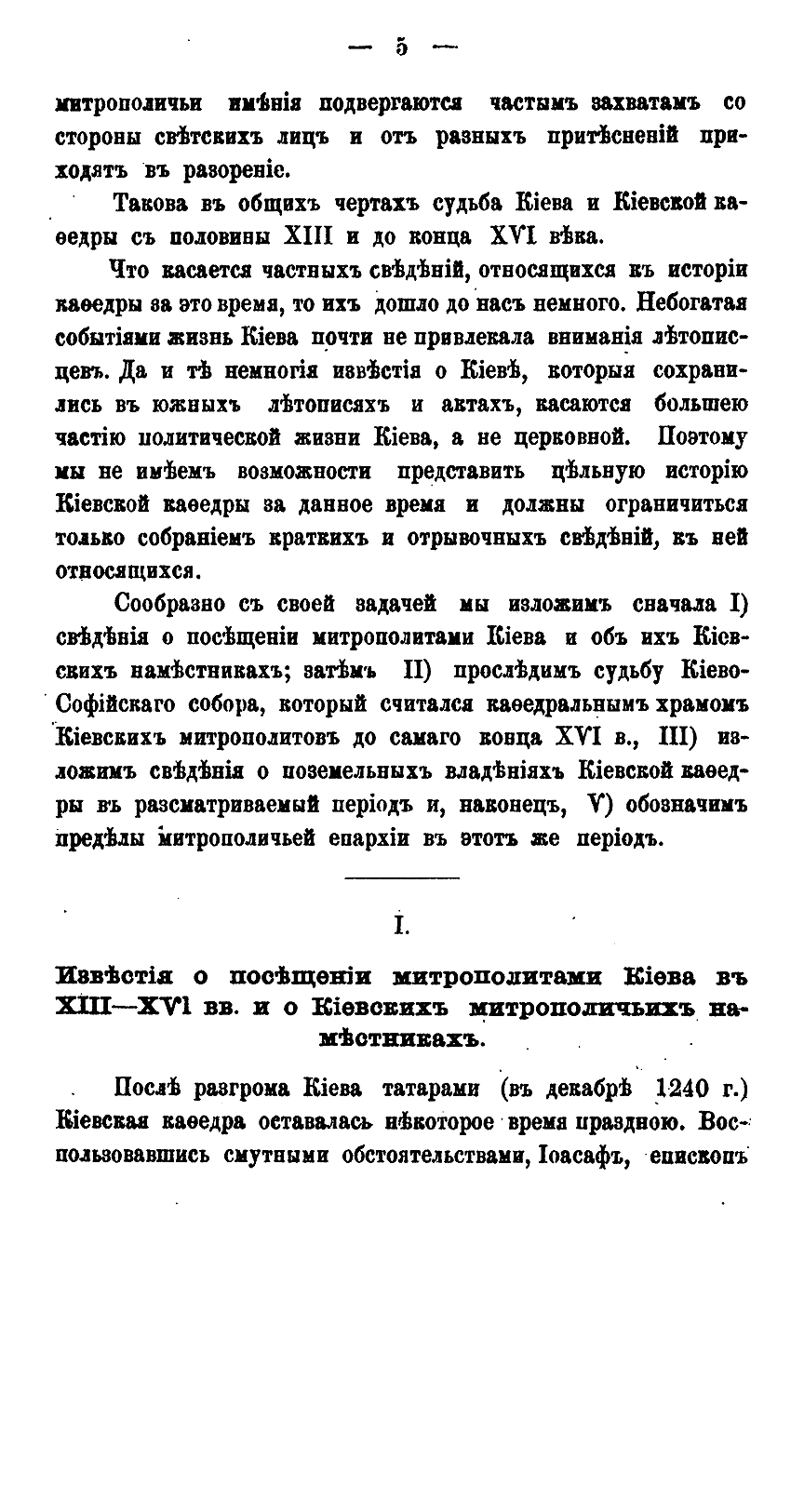 В своей небольшой, но насыщенной фактами работе известный писатель и богослов В.П. Рыбинский детально изучает судьбу Киевской мирополичьей кафедры в период, когда Киев утратил свое главенствующее положение среди русских городов. Нашествие Батыя, а затем отпадение Киевского княжества от Северо-Восточной Руси, где сосредоточилась политическая и духовная жизнь страны привели к тому, что уже с XIII века митрополиты удалились из города. Присоединение Киева к Литовскому государству также не способствовало возрождению духовного центра. Литовские князья добились независимости киевской митрополии от Москвы, однако и теперь митрополиты продолжали управлять кафедрой через своих наместников, приведя к концу XVI века дела Киевской митрополии к полному разорению…