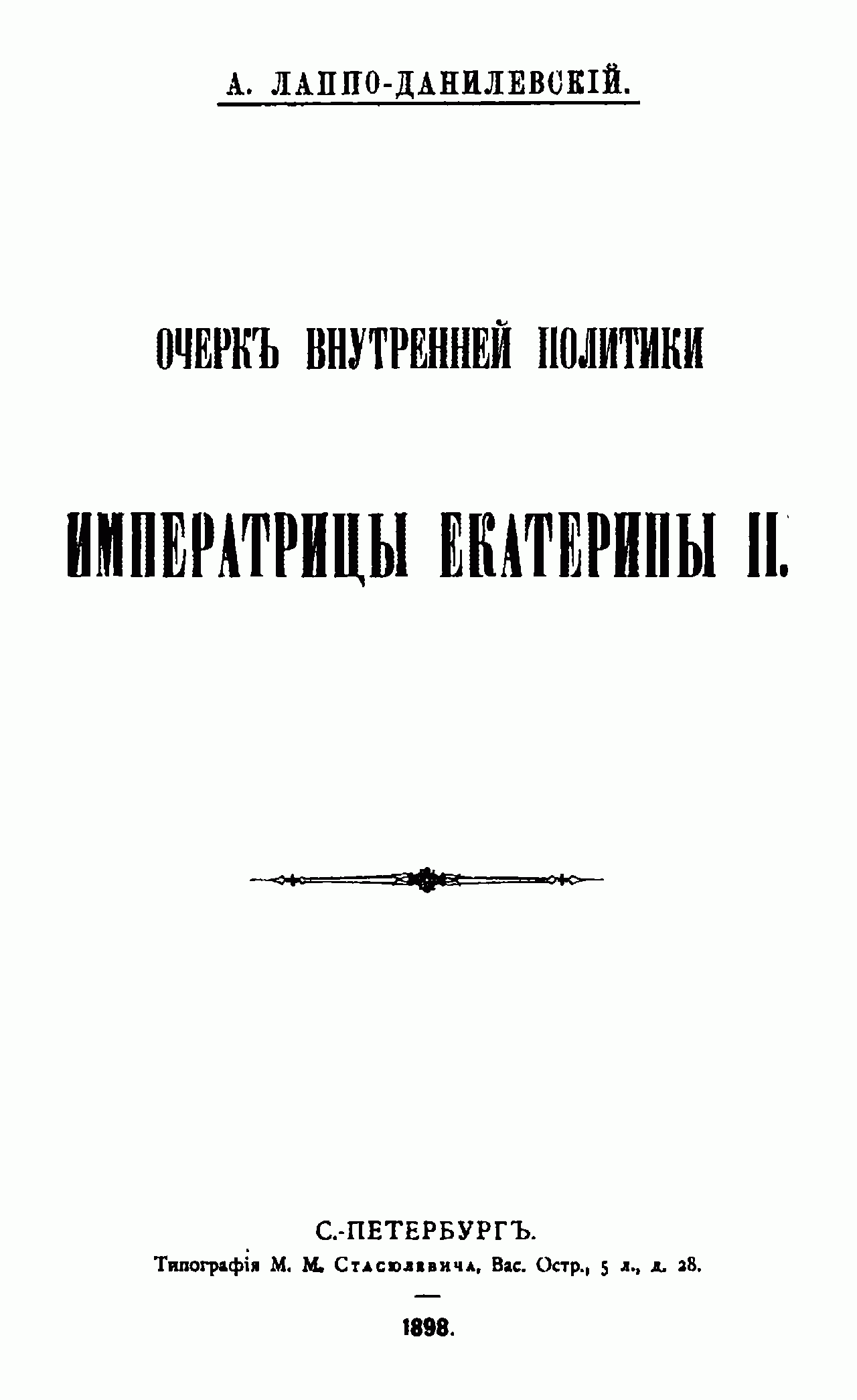 Солидное классическое монографическое исследование социально-экономического и политического развития России в эпоху Екатерины Великой принадлежит перу одного из известнейших отечественных историков – Александру Сергеевичу Лаппо-Данилевскому (15.01.1863–1919). В 1906 г. он был избран от Академии Наук и университетов членом Государственного совета, но вскоре сложил с себя это звание. Член Русского исторического общества, председатель Русского социологического общества, председатель Союза российских архивных деятелей, был сторонником масштабного реформирования архивного дела. Член Международного союза академий, председатель отдела культурных связей Русско-Английского общества. Был председателем исполнительного комитета по организации Международного исторического съезда в Петрограде в 1918 г., не состоявшегося из-за гражданской войны. Почётный доктор права Кембриджского университета (1916). Труды учёного по праву нашли широкое признание.