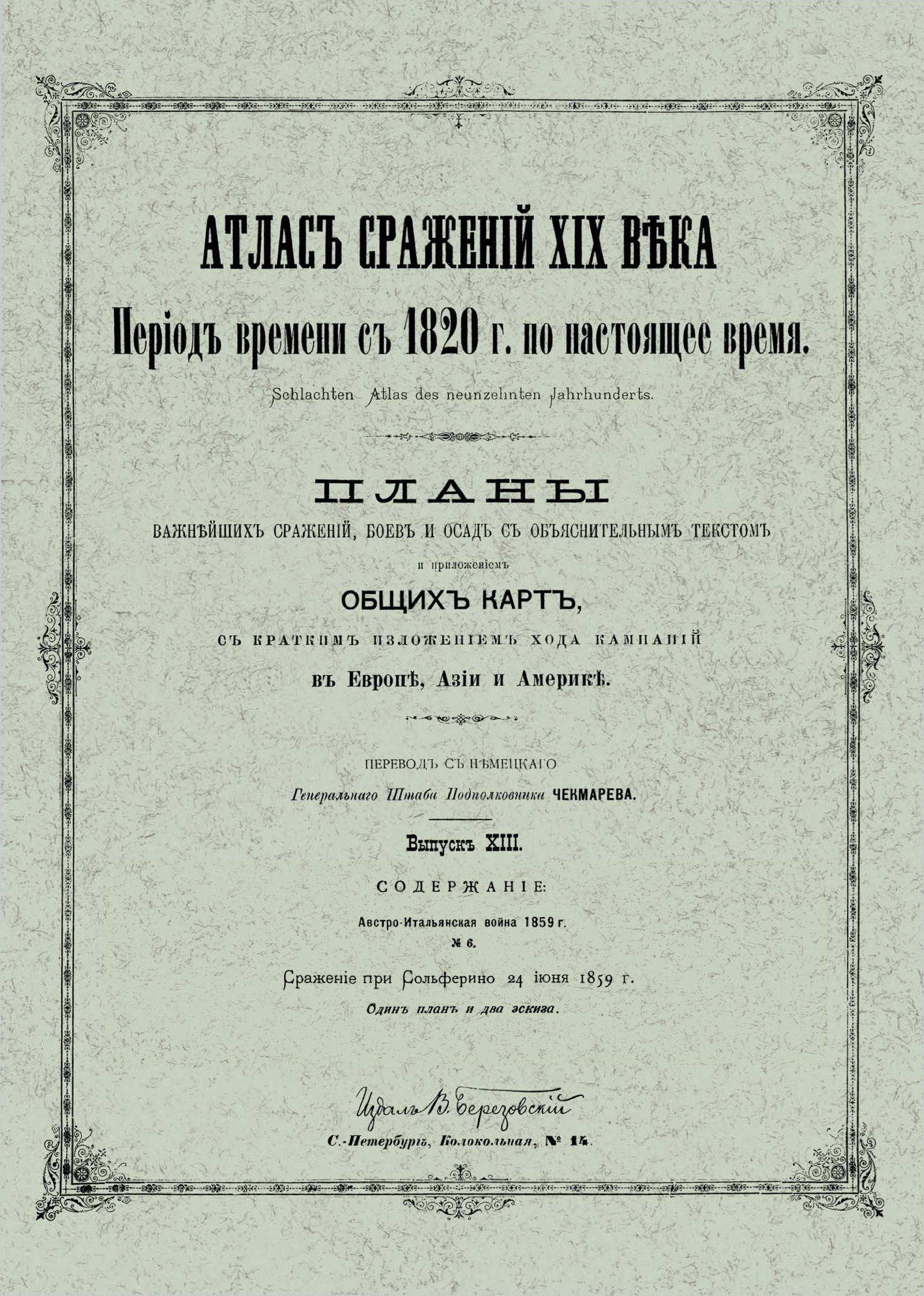 Второе издание «Атласа сражений XIX века» в 20-ти выпусках, представляет собой перевод на русский язык, выпускавшегося в военно-научном комитете Главного штаба на немецком языке с 1830-х гг., разрозненного собрания карт и планов военных кампаний армий мира в XIX века. Переводчиком данного издания является Виктор Иванович Чекмарев (1861–1939) — генерал-лейтенант (1912), видный военный деятель российской императорской армии, историк, участник Первой мировой войны и белого движения на юге России, впоследствии в эмиграции. С 1894 г., занимая должность делопроизводителя, а затем столоначальника канцелярии военно-ученого комитета Главного Штаба, подполковник Генерального Штаба Чекмарев, в результате кропотливой работы собрал воедино «Атлас сражений XIX века», каждый выпуск которого посвящен одной или нескольким военным кампаниям Европы, Азии и Америки, содержит подробное описание расположения войск и хода боевых действий противников, хронологию событий, снабжен картами и планами сражений. Это издание имеет большую историко-культурную ценность, интересно как ученым-историкам, так и любителям военно-исторической литературы.