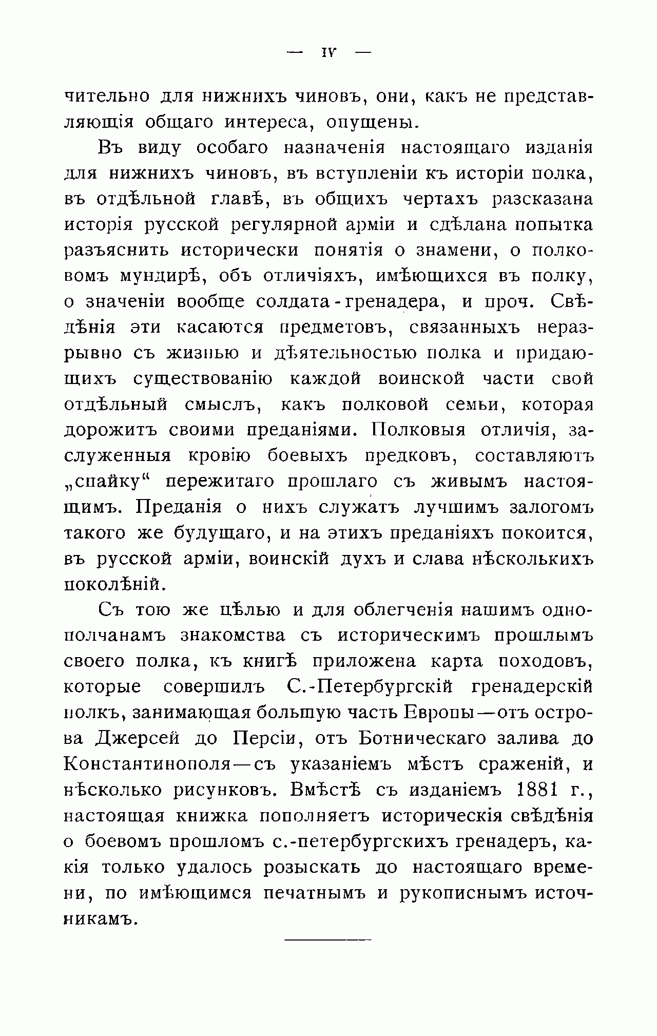 Данное издание представляет собой сжатый, популярный очерк истории Санкт-Петербургского гренадерского короля Фридриха Вильгельма III-го полка, подготовленный генералом Ф.Ф. Орловым для нижних чинов, написанный им на базе изданной за десять лет до этого подробной полковой истории. Создание этого полка связано с продвижением российских войск в Прикаспии и проведением Персидского похода в конце царствования Петра Великого. В 1726 г. было приказано в так называемом «Низовом корпусе» сформировать именной фон Лукиева полк в составе 1 гренадерской и 7 фузелерных рот. В дальнейшем полк неоднократно переименовывался и носил имена своих командиров. Однако, с 1801 г. он стал носить название Санкт-Петербургский, а после заграничных походов и разгрома Наполеона в Европе, полку было присвоено почётное имя короля Прусского, а затем он был причислен к лейб-гвардии.